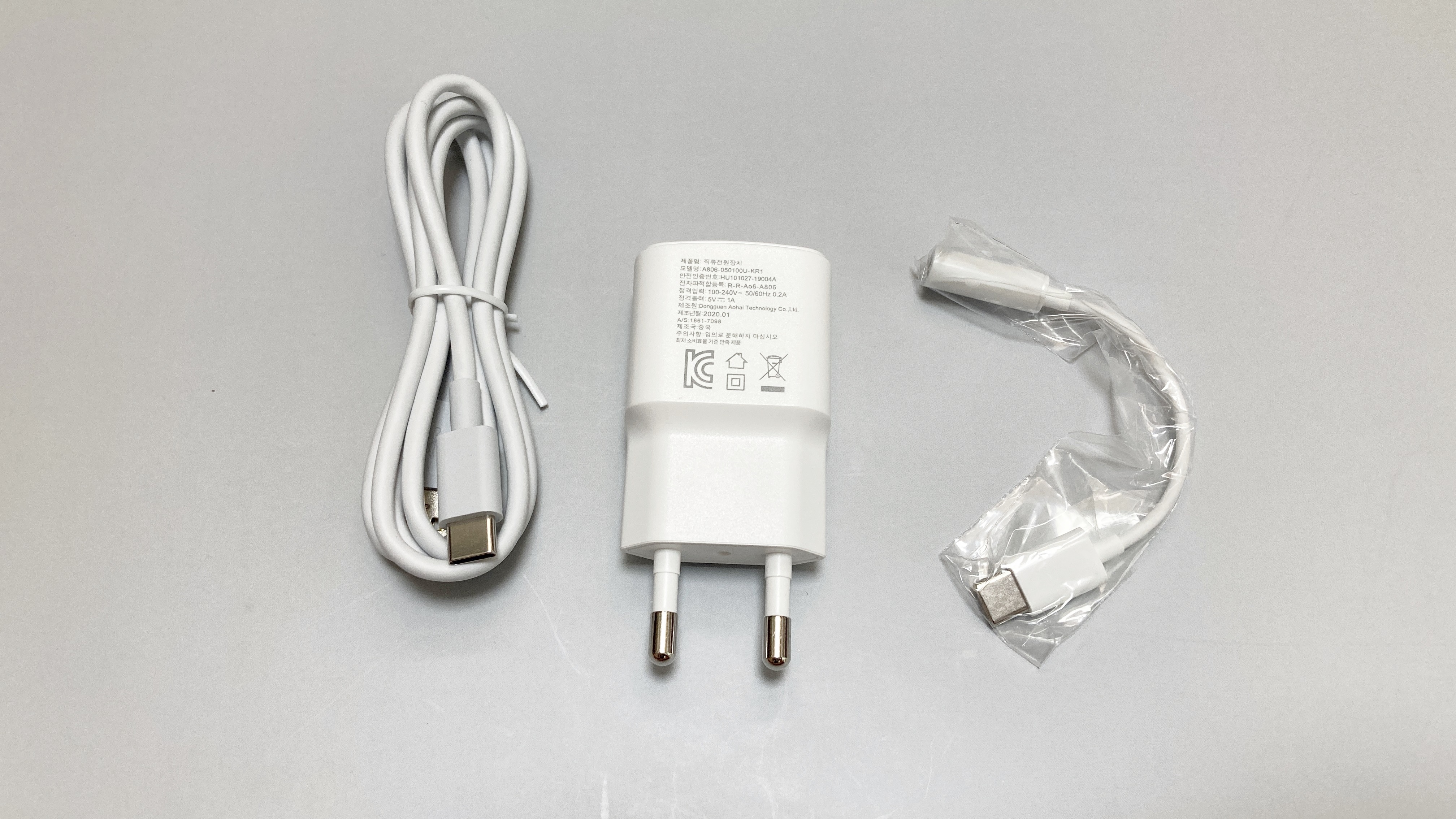 다른 구성품을 살펴 보겠습니다. 충전 케이블과 충전 어댑터가 있습니다. 그리고 C타입 이어폰 젠더도 있습니다. 이어폰잭이 없어 젠더가 필요하긴 하지만, C타입 이어폰 잰더가 들어 있는 것은 의외였습니다.