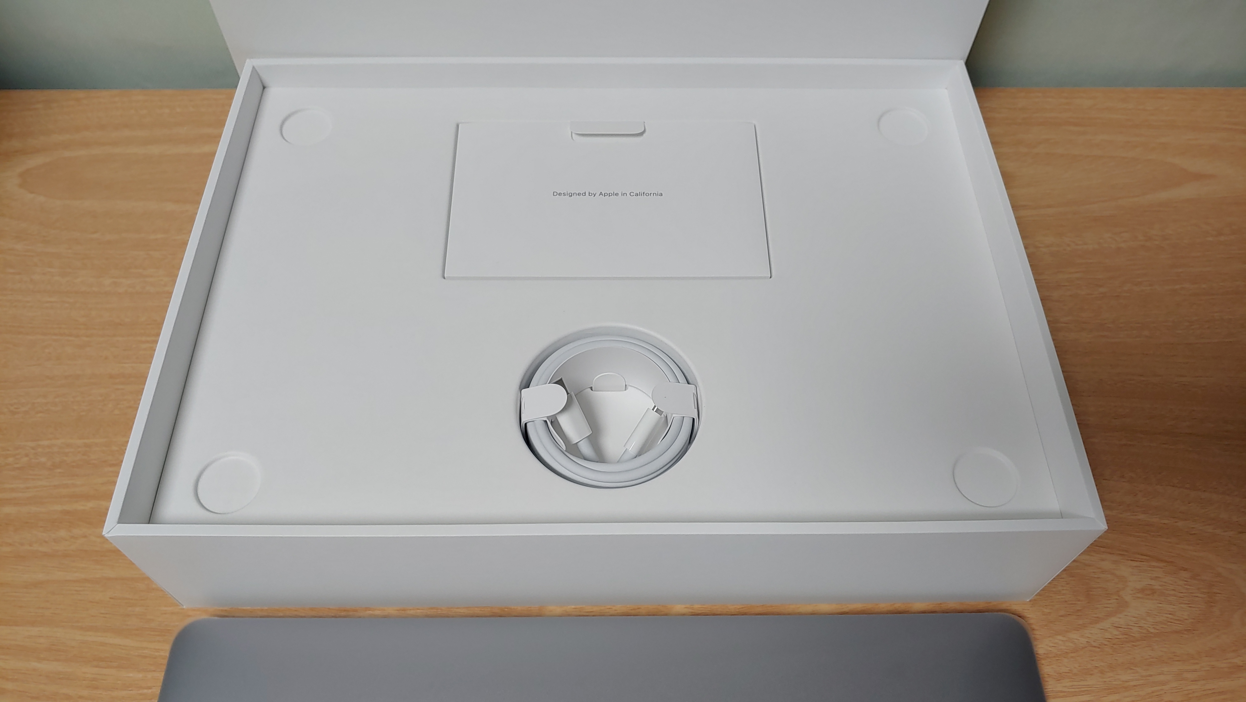 구성품은 정말 간단합니다. 노트북 본체, 충전 케이블, 충전 어댑터, 설명서 등입니다. 그리고 어디에 사용해야 하나 싶은 사과 스티커도 있습니다. 충전기 케이블은 C to C 이며, 어댑터는 30W충전기입니다.