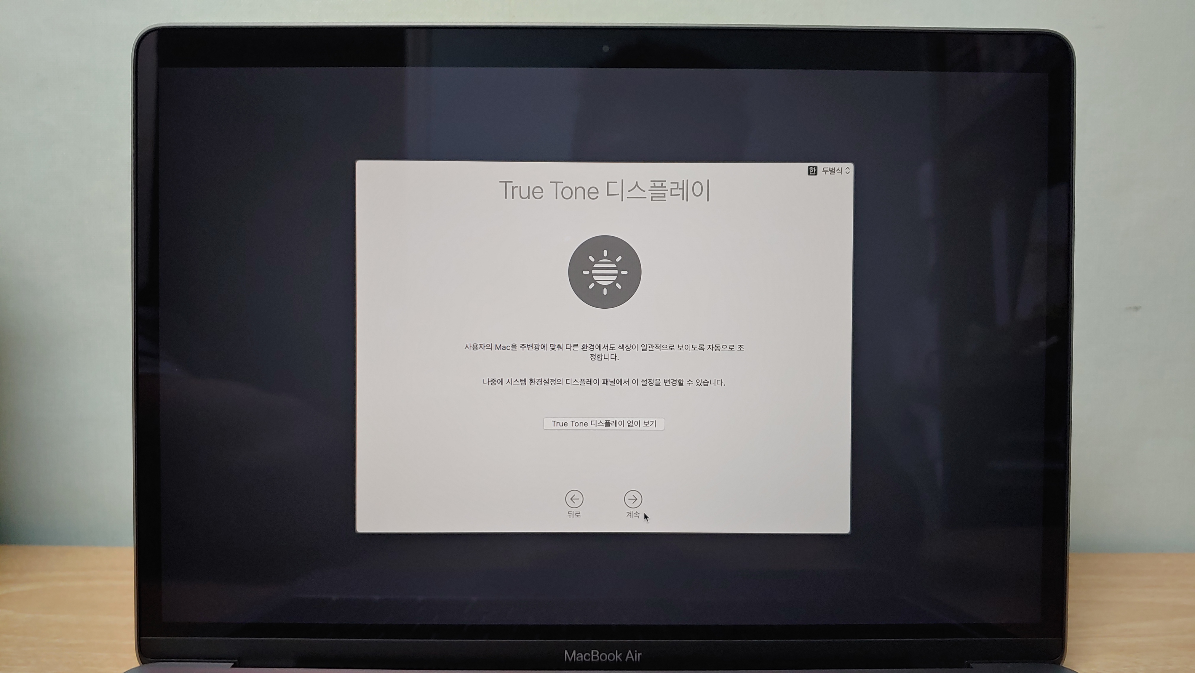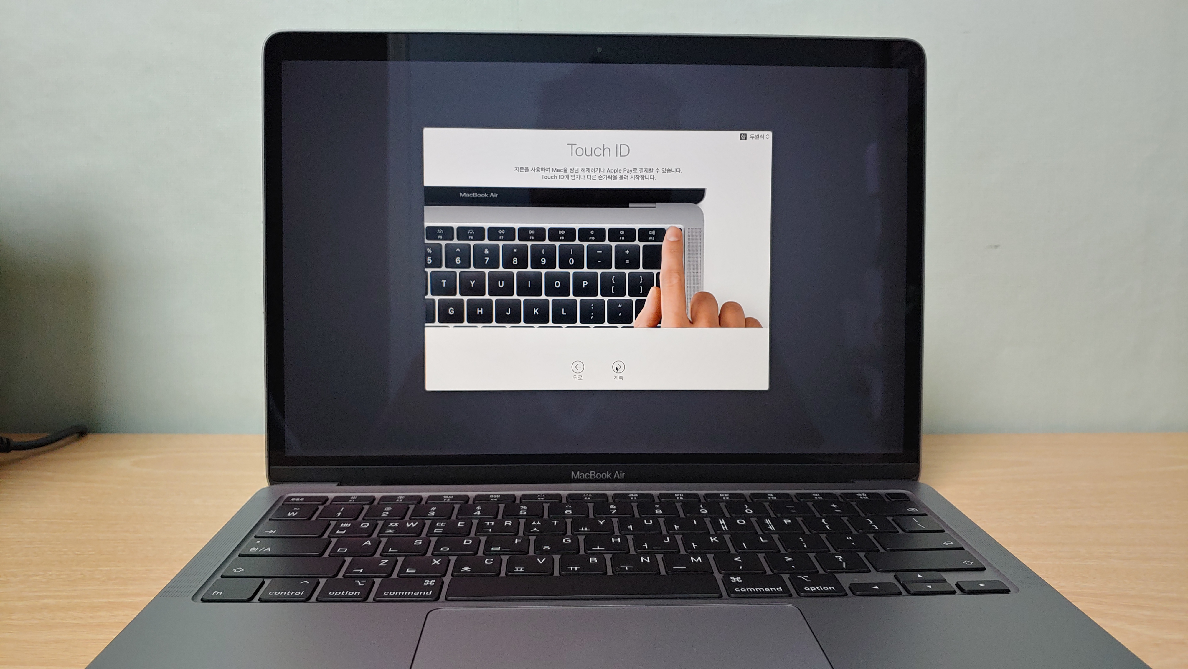 간단한 설정을 완료 했습니다. 맥북에어에도 오른쪽 상단에 터치ID가 들어가 있습니다. 잠금을 설정해 놓고 로그인 할 때 지문인식만 하면 바로 사용이 가능합니다. 그리고 트루톤 적용이 됩니다.