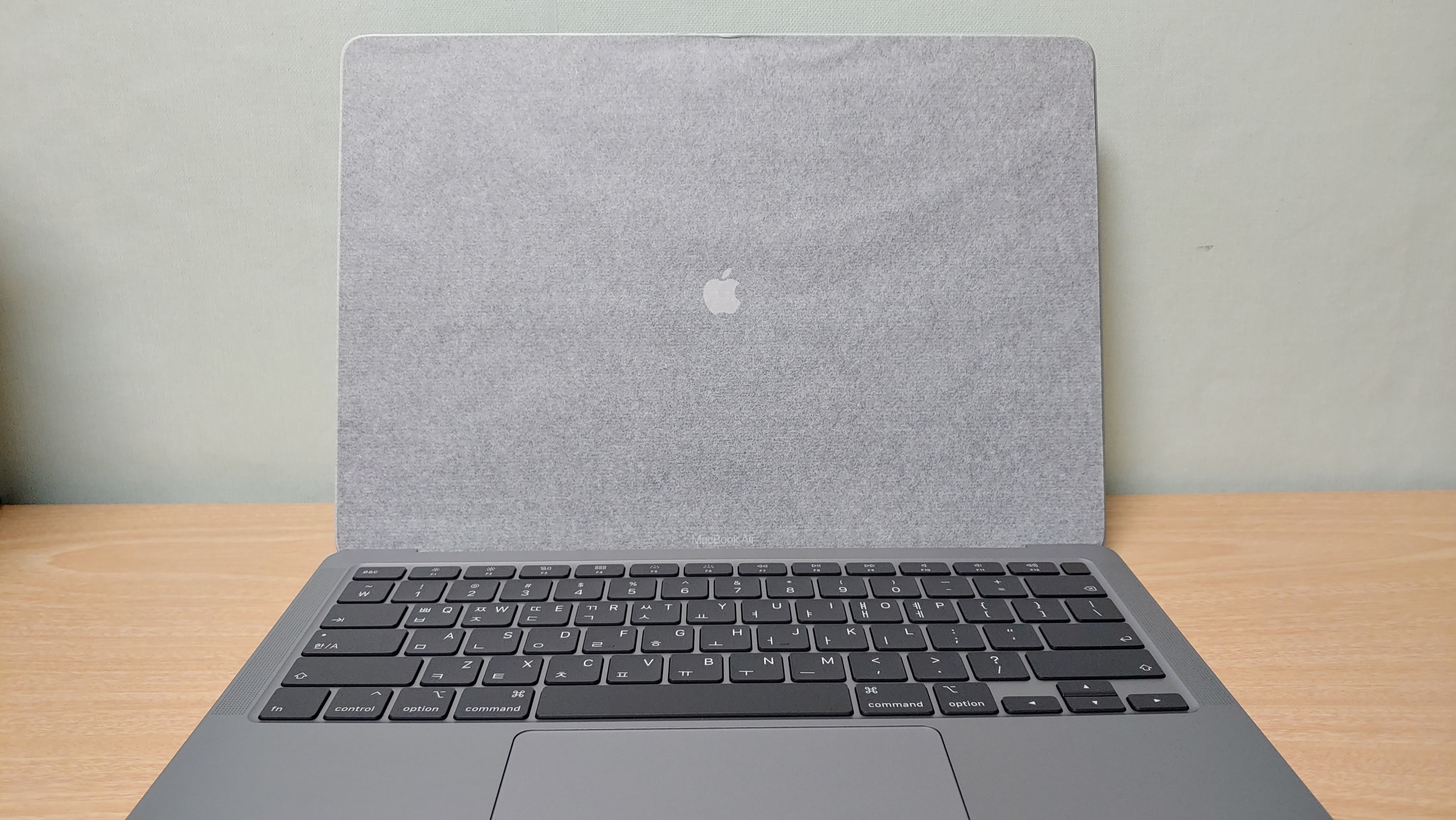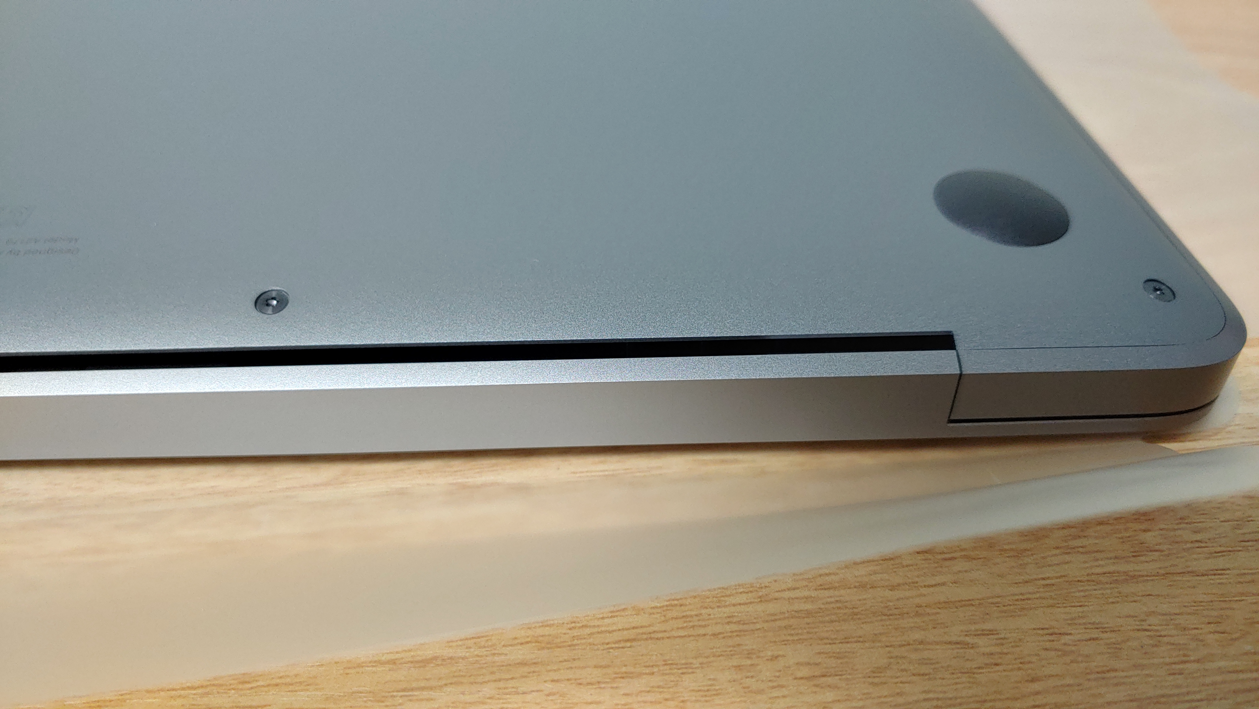 맥북 본체도 안전하게 포장이 되어 있습니다. 하단을 보면 고정이 되도록 고무가 4개 있습니다. 맥북에어를 구입하면서 정보를 찾아 볼때 가장 많이 나오는 말이 발열이 심하다는 것입니다. 하단을 보니 별도 공기가 나오는 곳은 없어 보입니다.