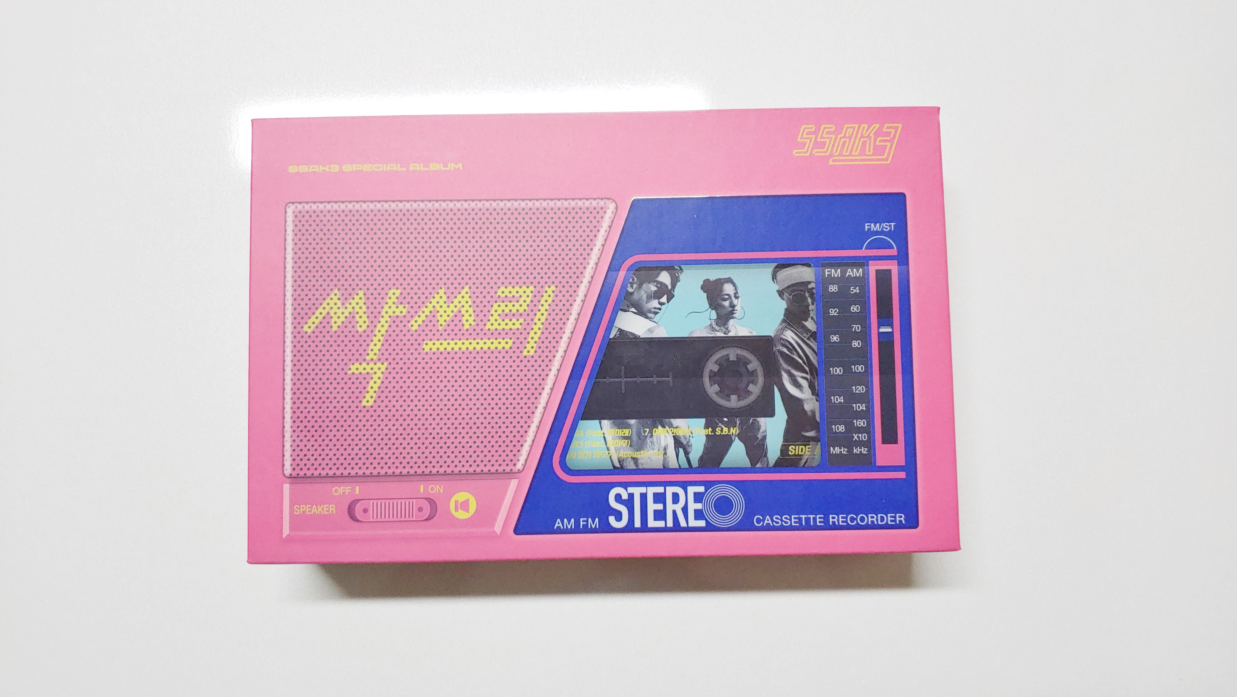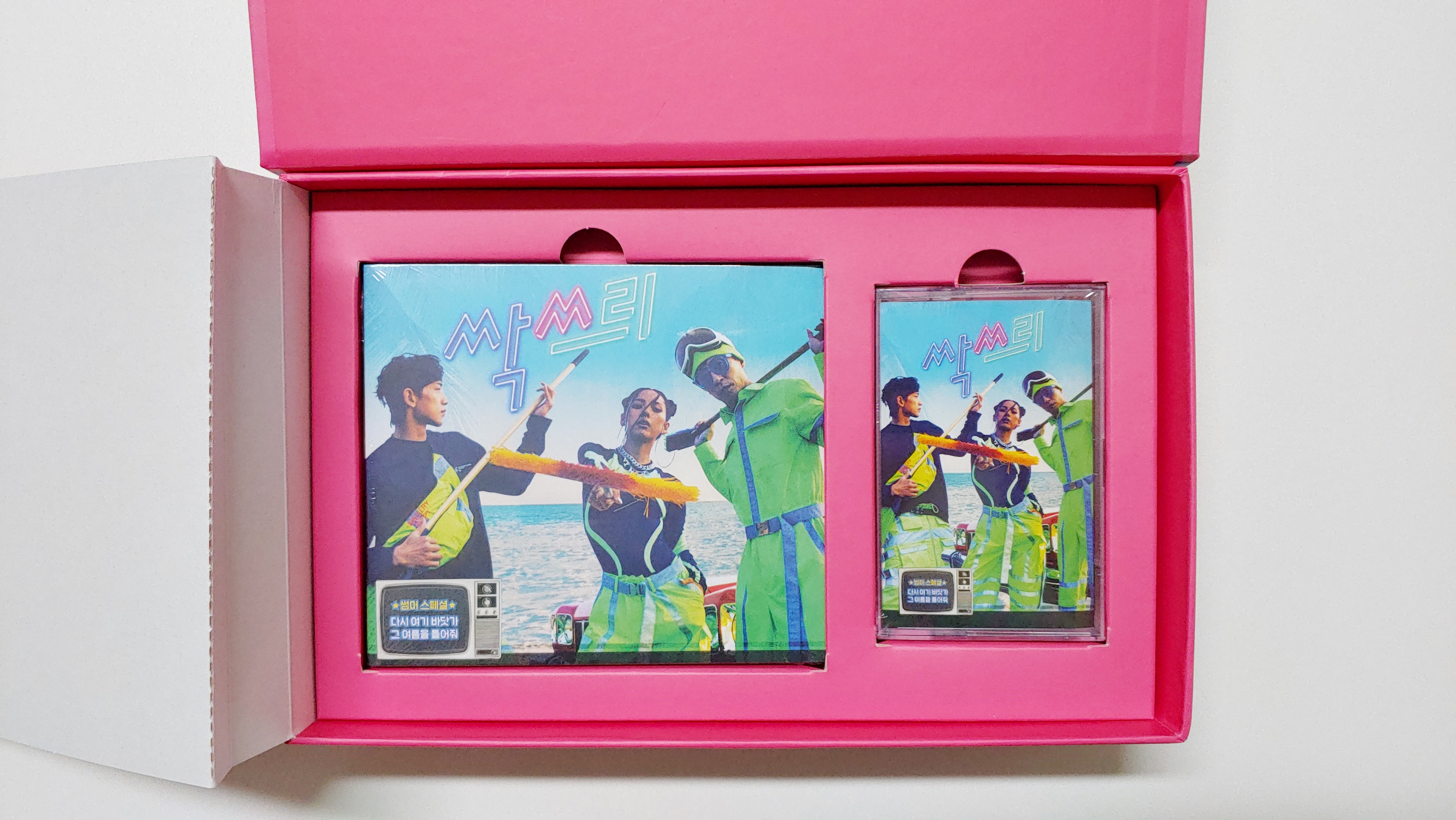 싹쓰리가 너무 좋아 앨범을 구매했습니다. 여러가지 패키지 구성이 있는데, CD와 테이프가 동시에 있는 패키지를 선택했습니다. 다른 이유는 없고 테이프가 너무 끌렸습니다. 박스를 보면 예전 테이프를 듣던 카세트 플레이어가 생각나는 디자인입니다.