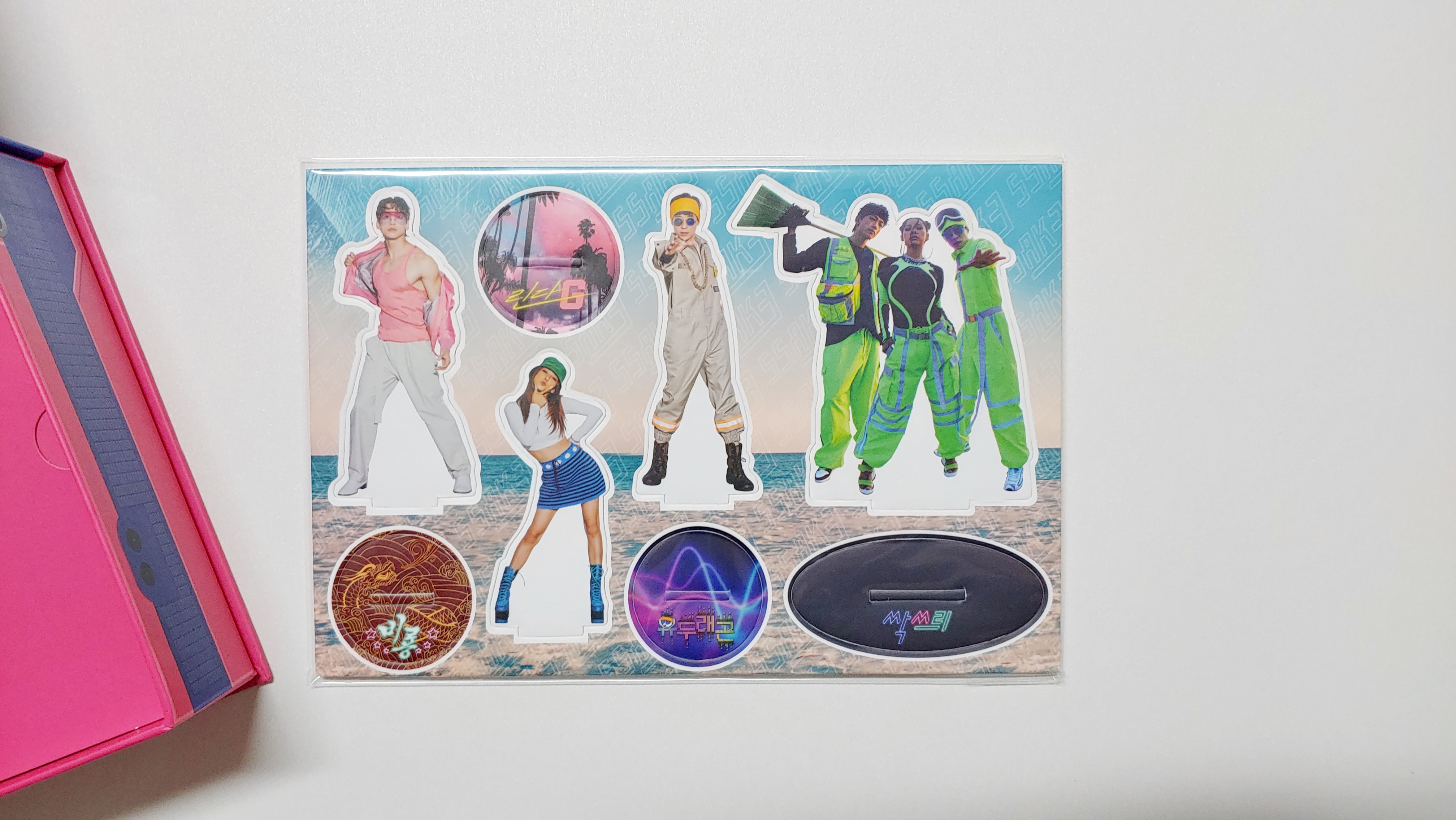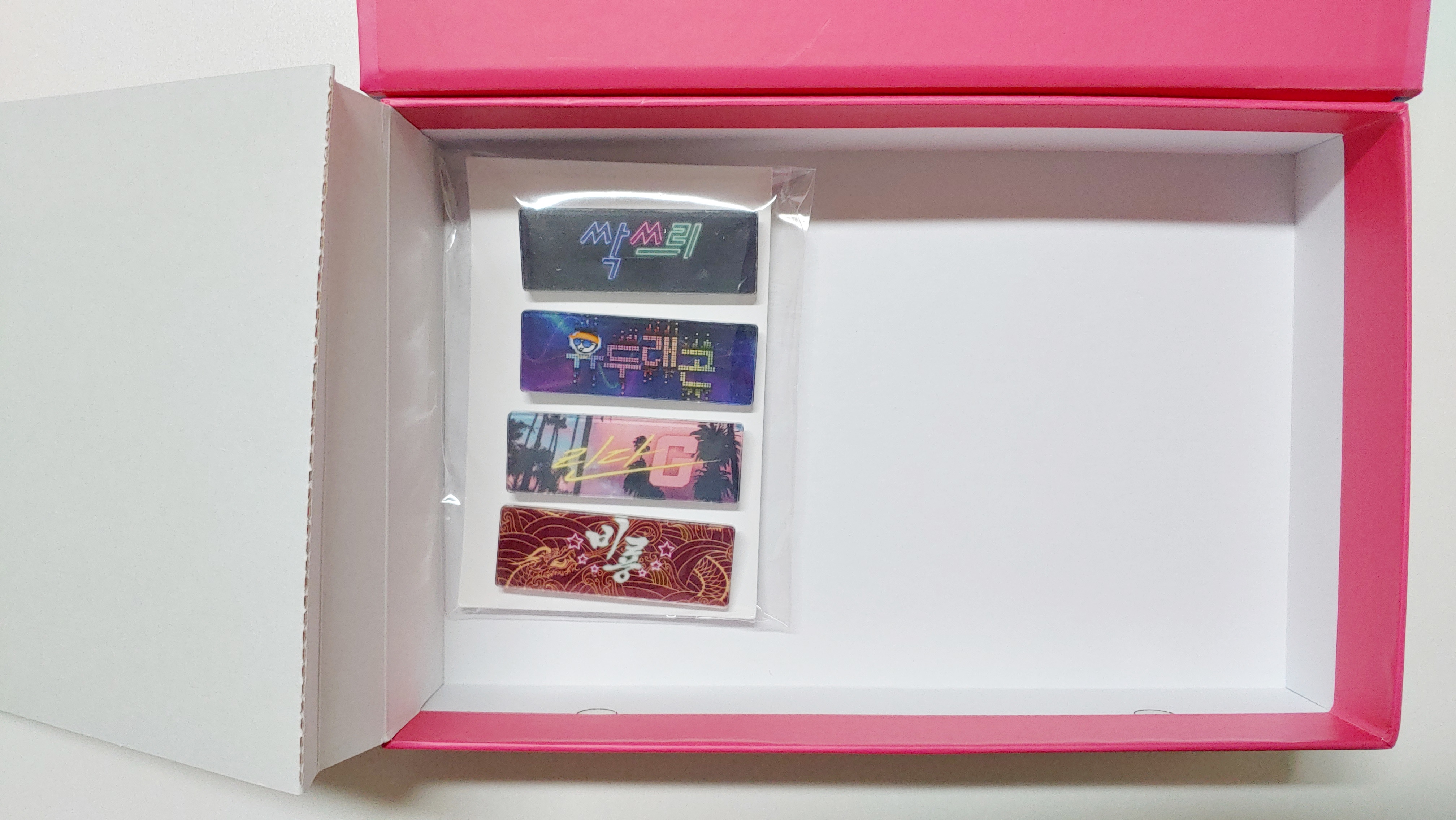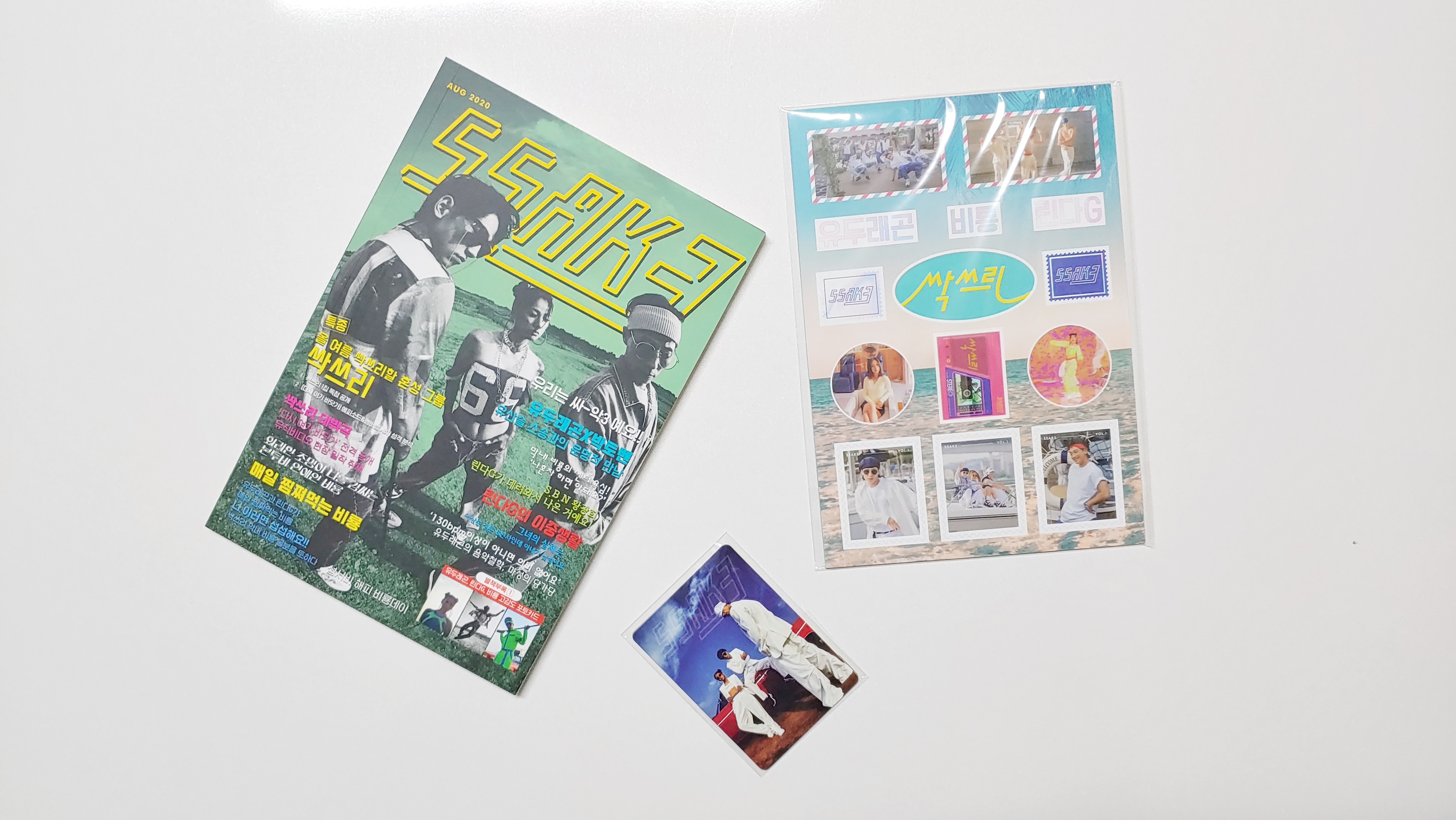 박스를 열면 싹쓰리 로고가 나오고 한 번 더 열면 화보집과 스티커 그리고 포토카드가 나옵니다. 화보집을 보면 예전 90년대 느낌을 살려 디자인 했습니다. 다양한 모양의 스티커가 있는데 붙이기 아까울거 같습니다.