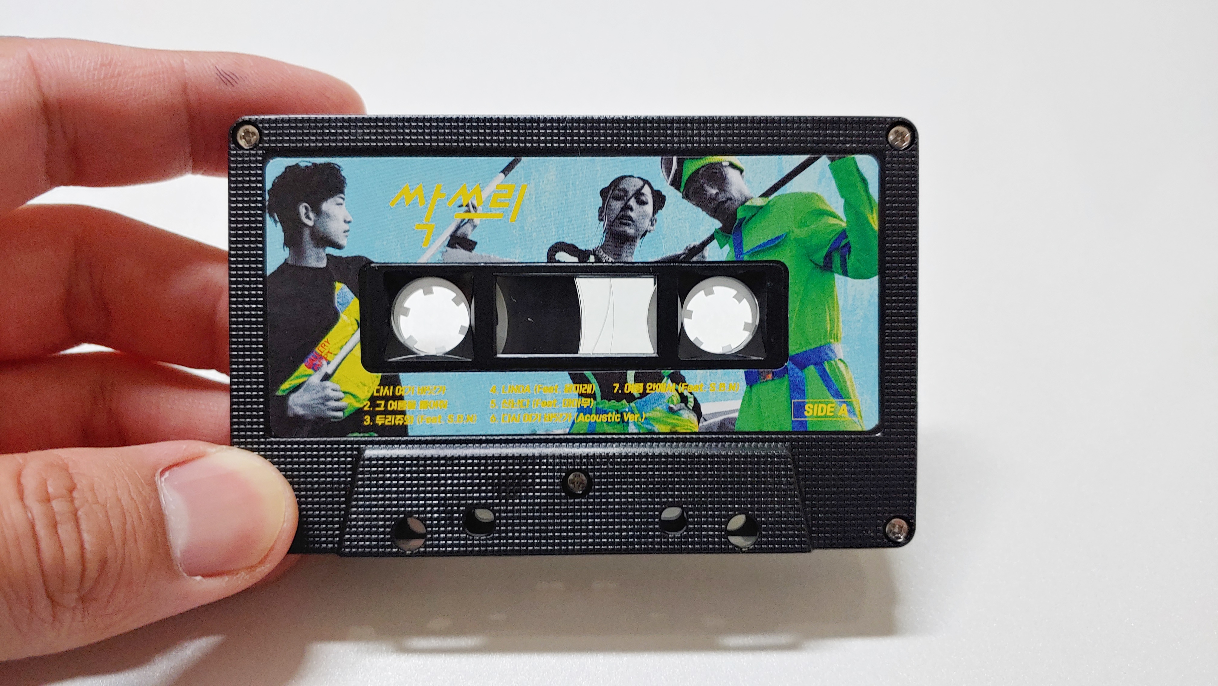 싹쓰리 테이프가 궁금해 바로 뜯었습니다. 어렸을 때는 많이 샀는데 요즘은 보기 어려운 제품입니다. 예전에 보던 모습과 딸깍거리는 소리까지 그대로입니다. 테이프 표지에 가사 목록까지 아주 디테일하게 만들었습니다.