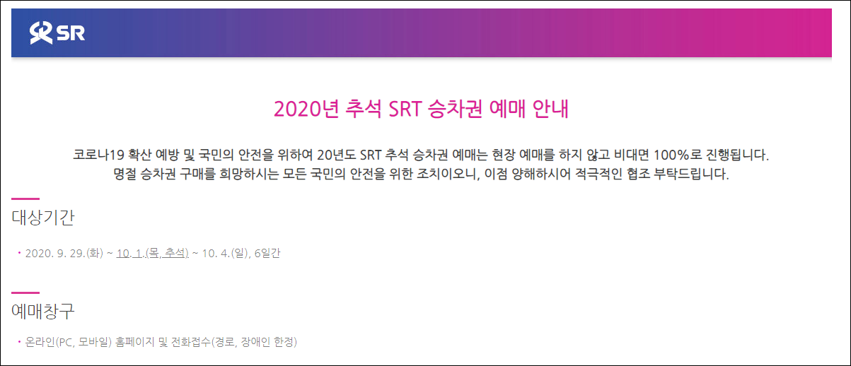 SRT 승차권 예매 역시 현장 예매를 하지 않고 100% 비대면으로 진행을 합니다. 그래서 온라인인 PC나 모바일로만 가능합니다. 승차권 대상 기간은 20년 9월 29일(화)부터 10월 4일(일) 6일간입니다.