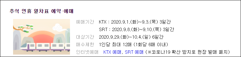 2020년 추석이 한달 앞으로 다가왔습니다. 코로나가 잠잠해지지 않아, 걱정인데 최근에 다시 잠잠해지는 분위기입니다. 최악의 경우 추석에 고향을 가지 못하는 경우도 발행할 수 있었는데, 그정도는 아닐 것으로 보여 다행입니다. 명절에 집에 가기 위해 자가용이나 대중교통을 이용합니다. 자가용이 편리하지만 차가 너무 막혀 시간이 오래 걸립니다. 그래서 교통 걱정없는 기차를 이용하는 분들이 많이 있습니다. 오늘은 2020 추석 기차표 예매에 대해 살펴 보겠습니다.
