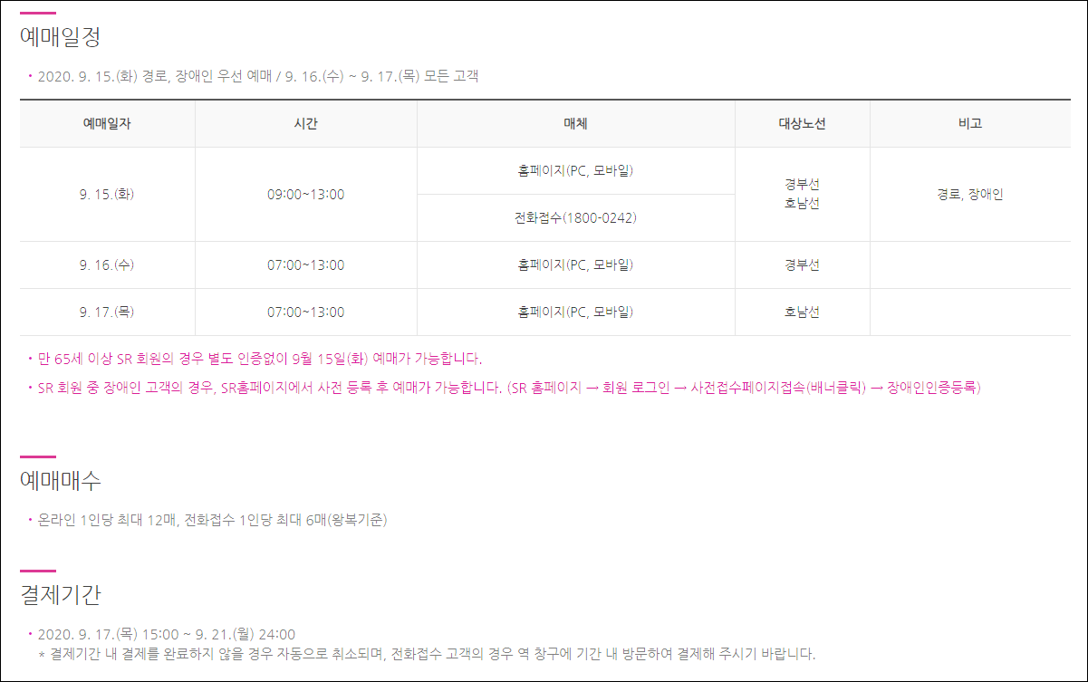 9월 15일 09:00 - 13:00 : 경부선, 호남선(전화접수 가능, 경로와 장애인)
