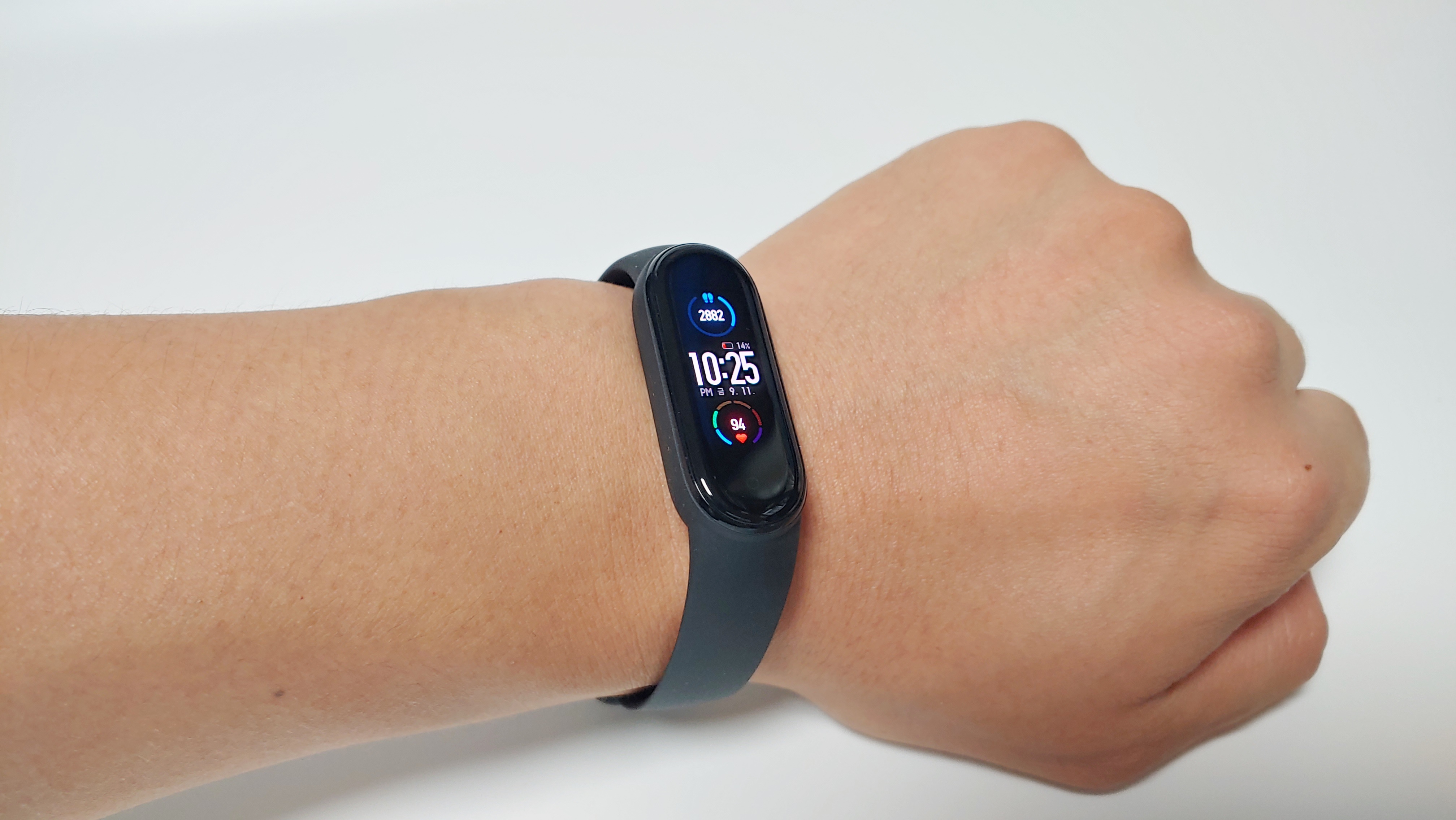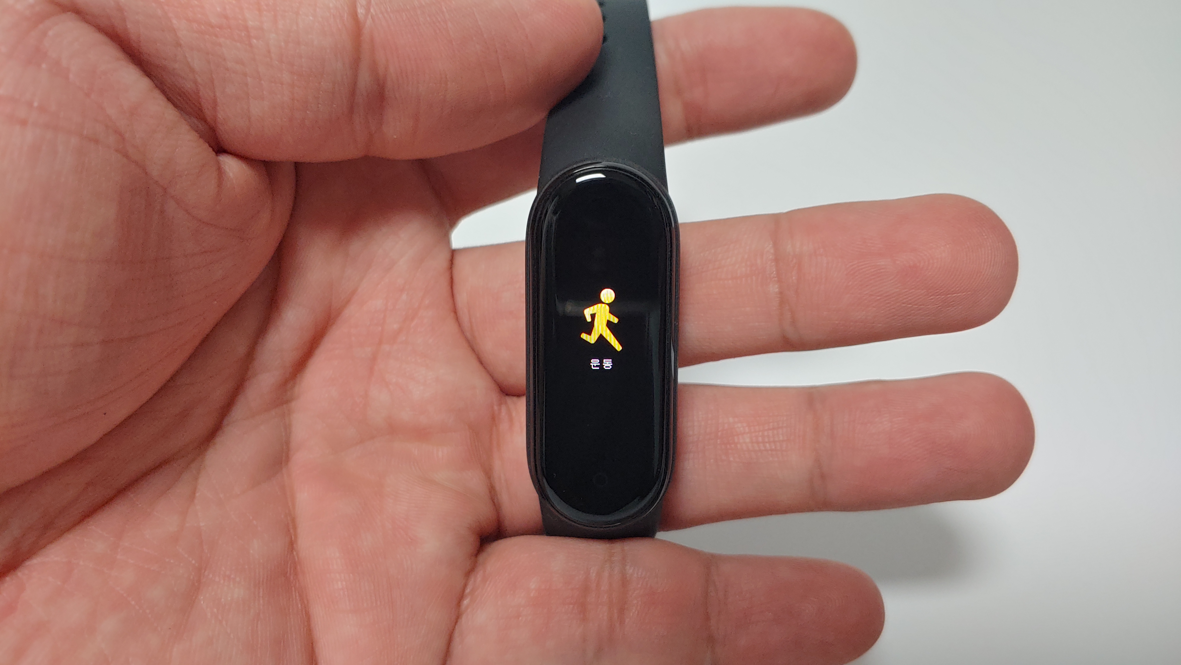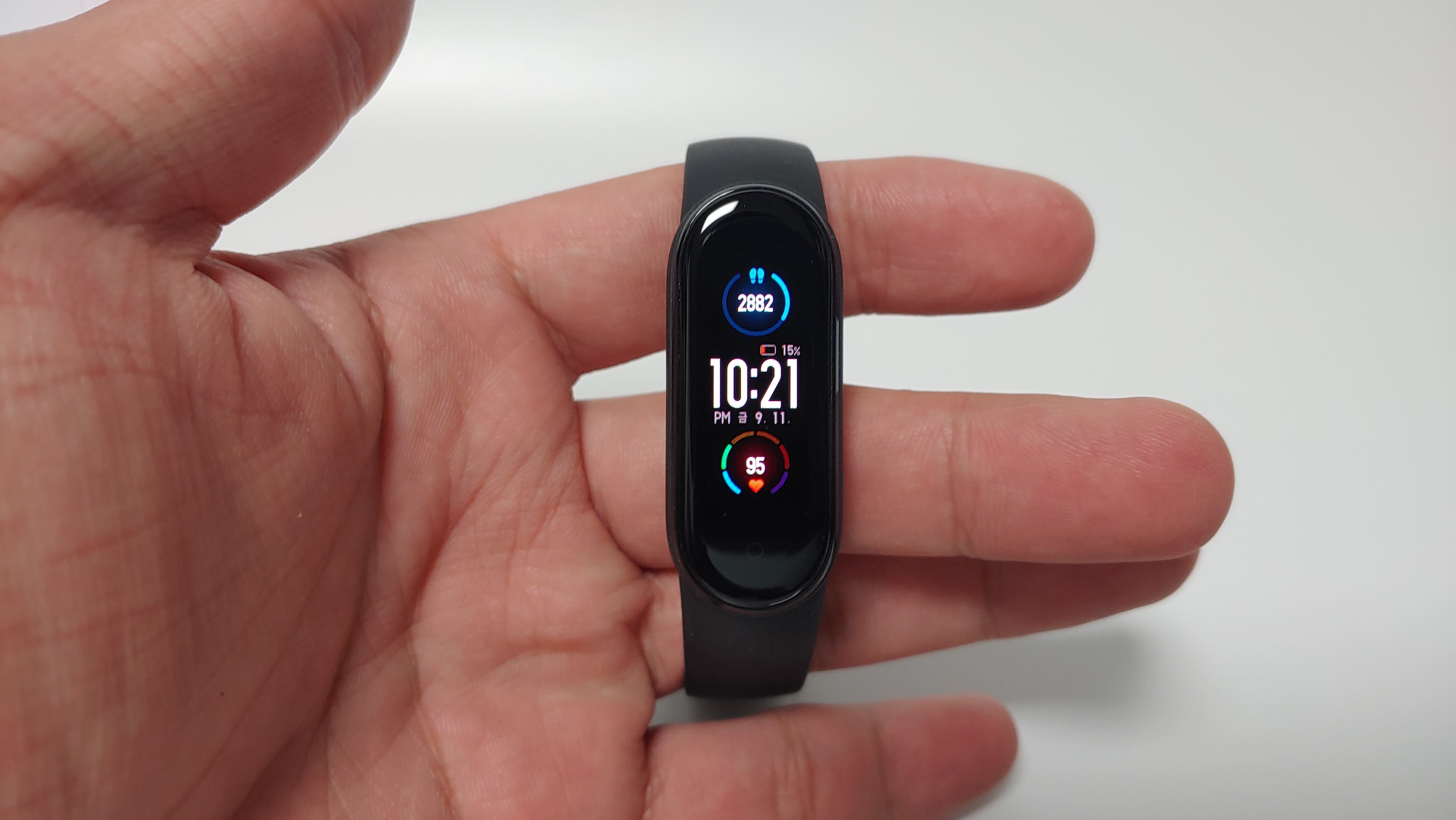 화면이 0.95인치에서 1.2인치로 커졌습니다. 수치를 보면 상당히 큰 차이가 나는데 언뜻 보기에는 차이를 잘 모르겠습니다. 그래서 미밴드4와 비교를 해봤는데, 화면 크기가 확연하게 차이가 나긴 합니다. 그렇지만 실사용에서는 화면이 커졌다는게 크게 느껴지진 않습니다. 아주 미세한 차이지만 화면 테두리가 살짝 둥글해 졌습니다.