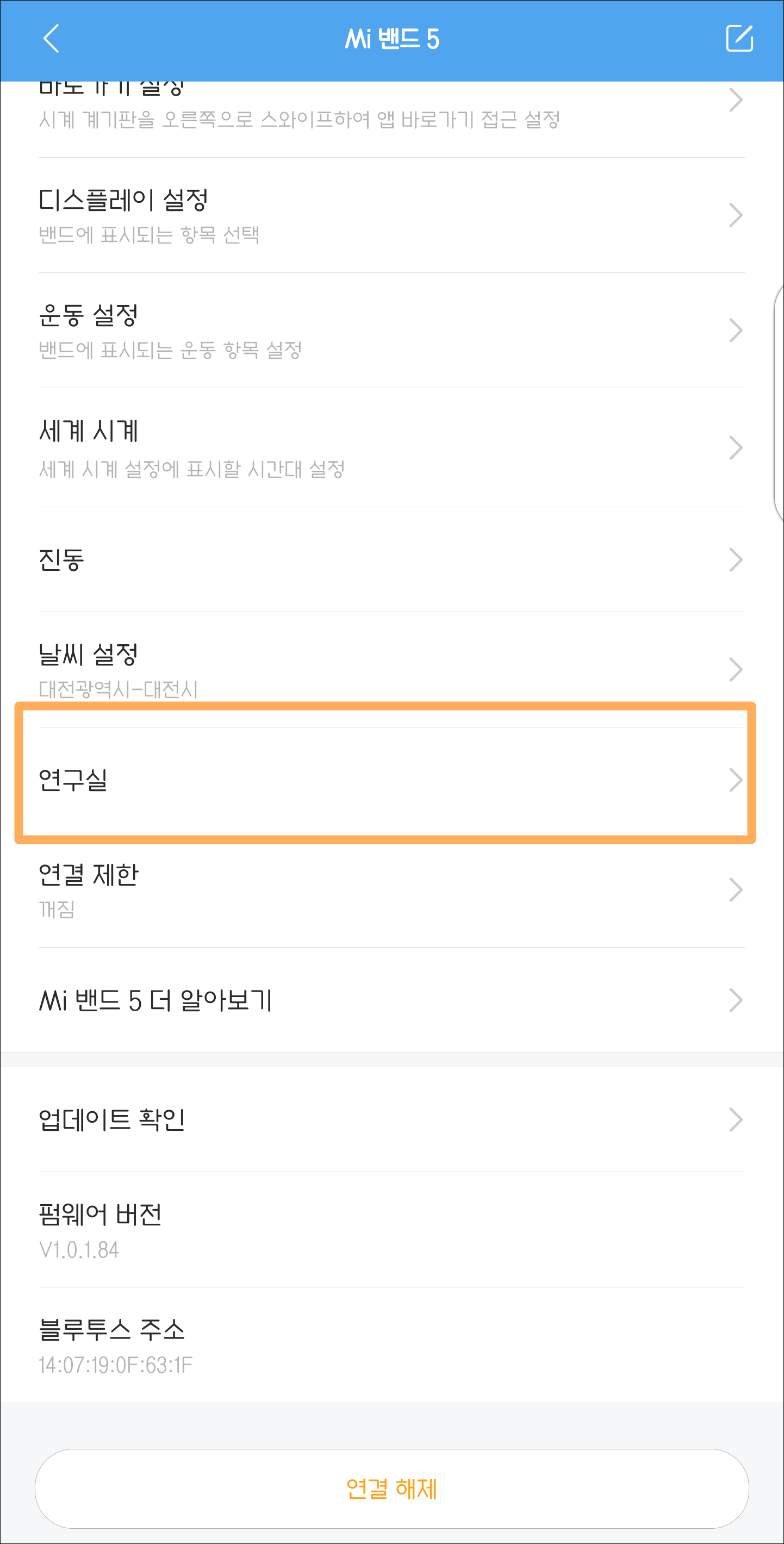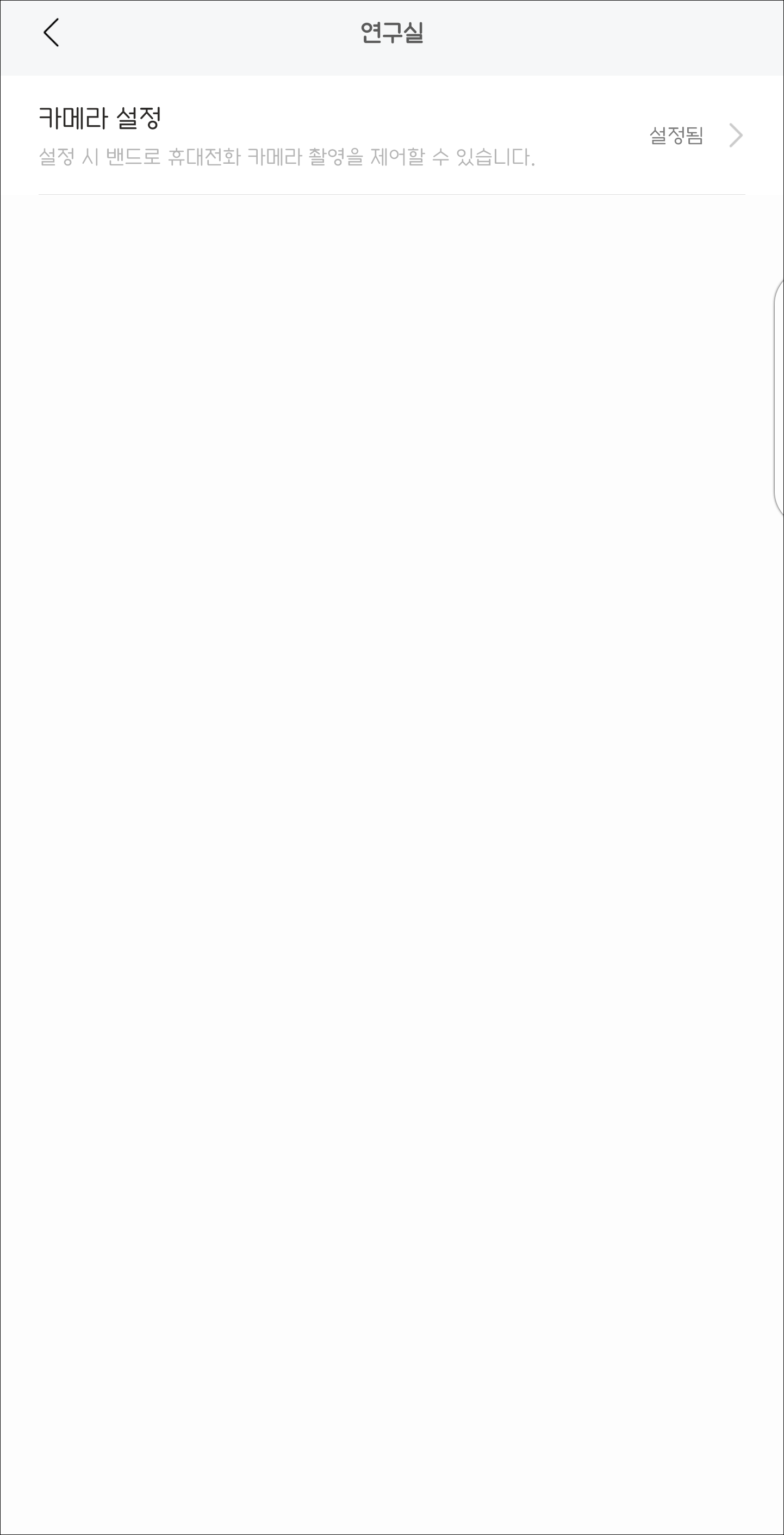 이 기능을 바로 사용할 수는 없고 미핏앱에서 설정을 해줘야 합니다. 기기설정에서 연구실 메뉴에 들어가면 카메라 설정이 있습니다. 여기에서 블루투스 연결을 해주면 카메라 리모트 셔터 기능을 사용할 수 있습니다.