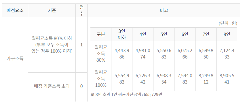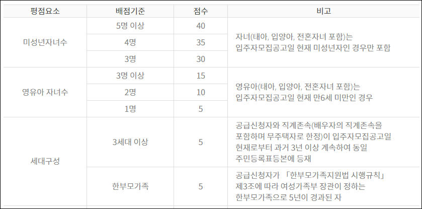 다자녀 특별공급도 경쟁이 있는 경우 별도 배점기준표를 통해 점수를 매겨 높은 점수를 갖고 있는 분이 당첨이 됩니다. 미성년자녀수, 영유아 자녀수, 세대구성, 무주택기간, 해당시도 거주기간, 입주자저축 가입기간을 기준으로 합니다. 다자녀이기 때문에 자녀수가 많으면 점수가 높고 거기에 만 6세 미만 영유아가 많은 세대가 유리합니다.