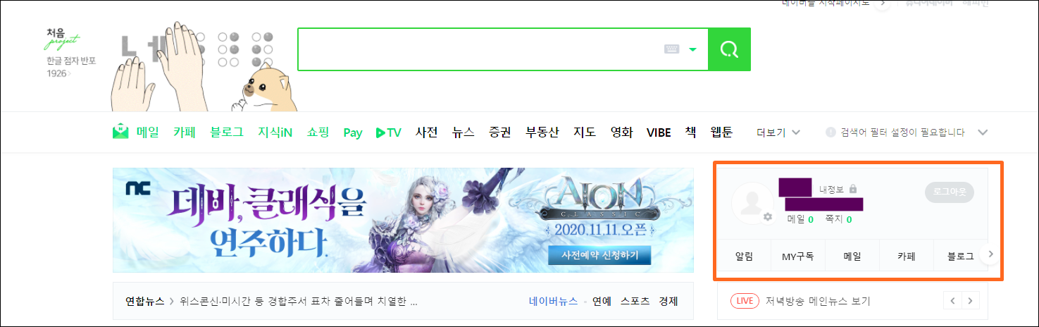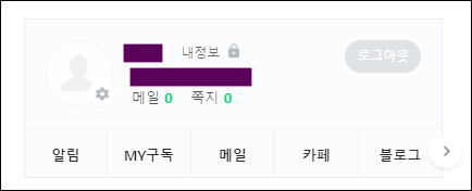 일단 네이버 회원탈퇴를 하기 위해서는 로그인을 해줍니다. 로그인한 제일 처음 화면인데, 오른쪽 상단을 보면 로그아웃이 있고 그 옆에 내 정보라는 메뉴가 있습니다. 이곳을 클릭해주세요.