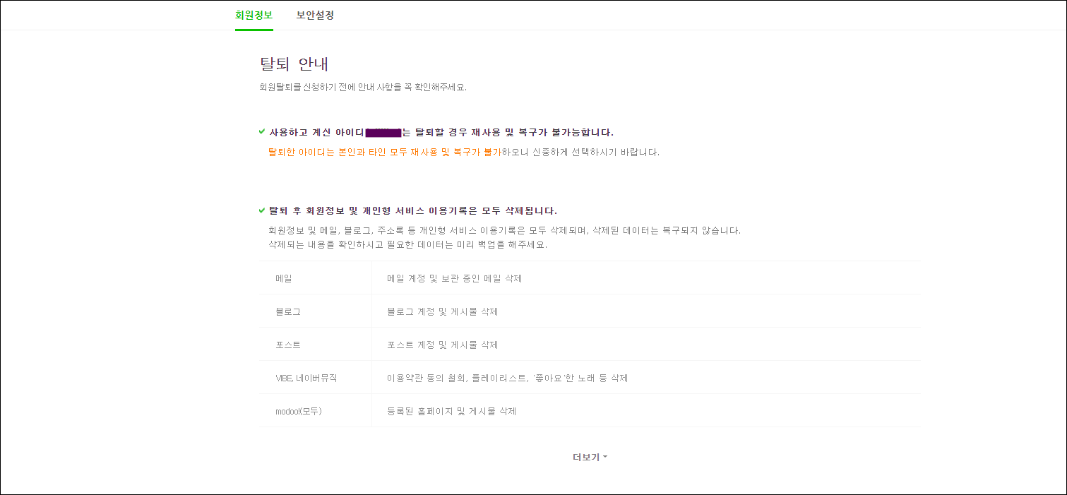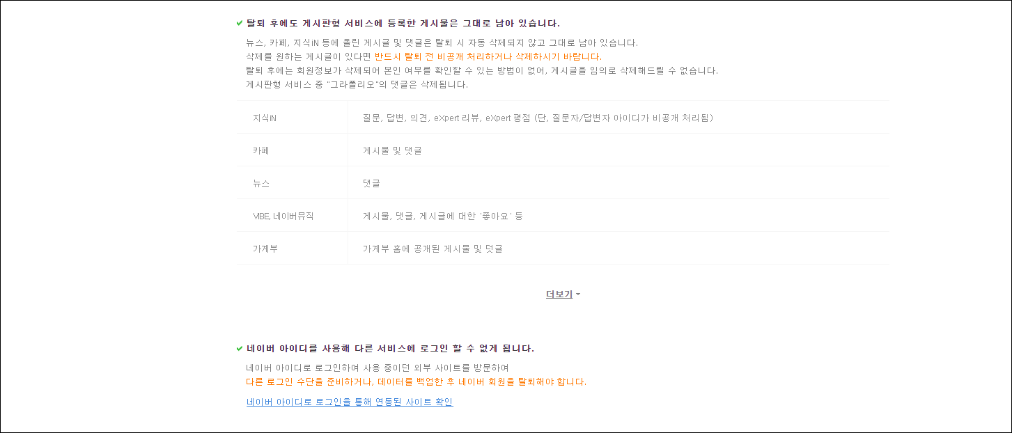 이곳에서는 네이버 회원탈퇴를 하게 될경우 어떻게 되는지 상세히 나와 있습니다. 가장먼저 메일 계정 삭제와 보관중인 메일도 삭제 됩니다. 그리고 블로그, 포스트의 계정과 게시물이 삭제됩니다. 하지만 지식인이나 카페, 뉴스 댓글 등은 그대로 남아 있습니다.