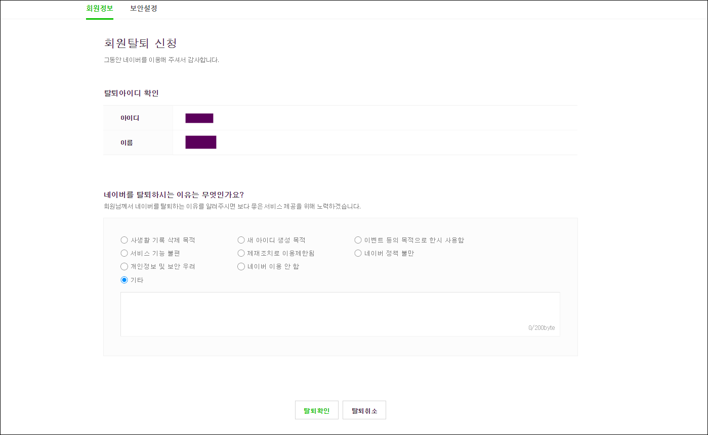 회원탈퇴의 과정이 생각보다 깁니다. 마지막으로 탈퇴 아이디 확인을 하고, 네이버를 탈퇴하는 이유를 선택하고 탈퇴확인을 눌러주면 됩니다. 그러면 계정이 삭제가 됩니다. 회원탈퇴 메뉴를 찾는게 어려워서 그렇지 과정은 생각보다 간단하네요.