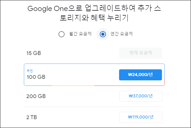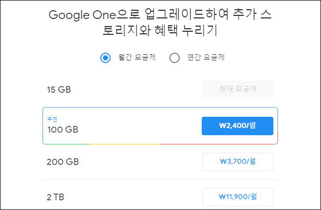 구글 포토 용량을 늘리기 위해서는 100GB 기준 한달에 2,400원(년 24,000원)을 최대 2TB의 경우는 년 119,000원의 비용을 지불해야 합니다. 100GB이 경우 한달 사용금액으로 보면 크게 부담이 되진 않지만 사진이나 영상을 많이 촬영하다 보면 금방 넘어갈거 같긴 하네요.