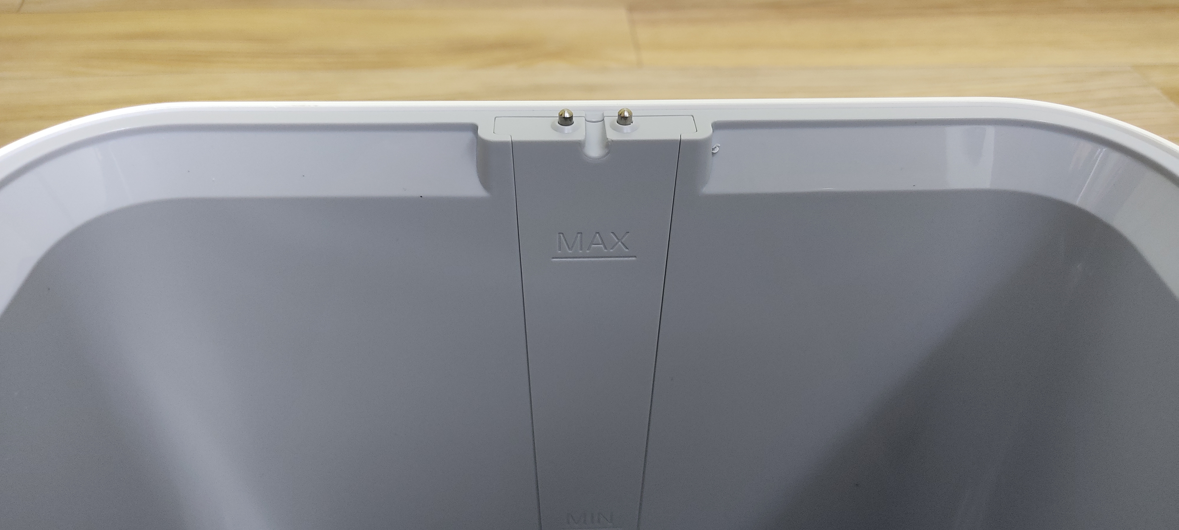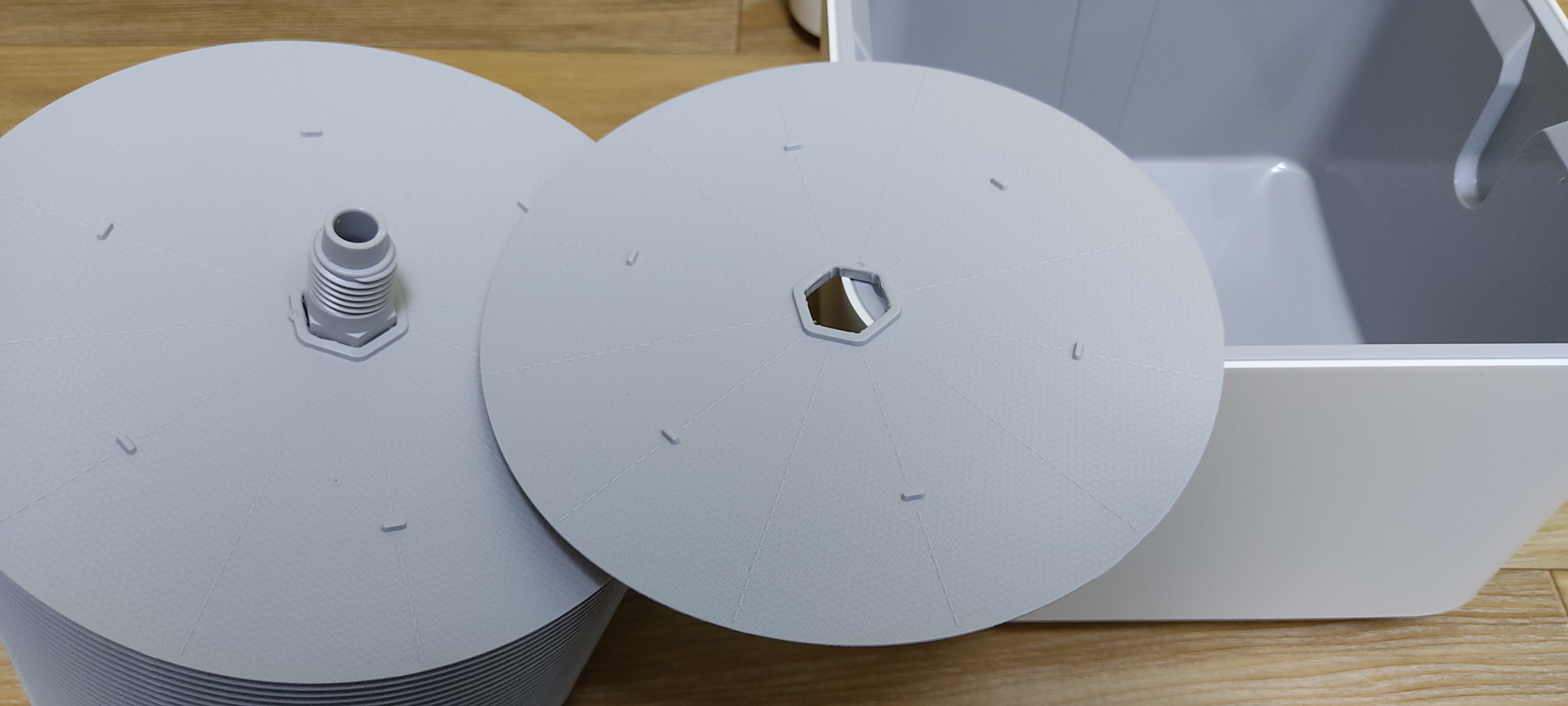 샤오미 자연기화식 가습기는 상단과 하단으로 분리된 구조입니다. 먼저 하단을 살펴보겠습니다. 물탱크와 디스크로 간단하게 구성되어 있네요. 디스크는 여러장이 겹쳐져 있으며, 조임 부분을 풀어 청소를 할 수 있습니다. 물탱크에는 상단과 연결하는 전원 포트가 보입니다. 그리고 물의 수위를 표시하는 선이 있습니다. MIN이상으로 물을 채워야 가습기가 작동을 하며, MAX를 넘기면 작동을 하지 않습니다.