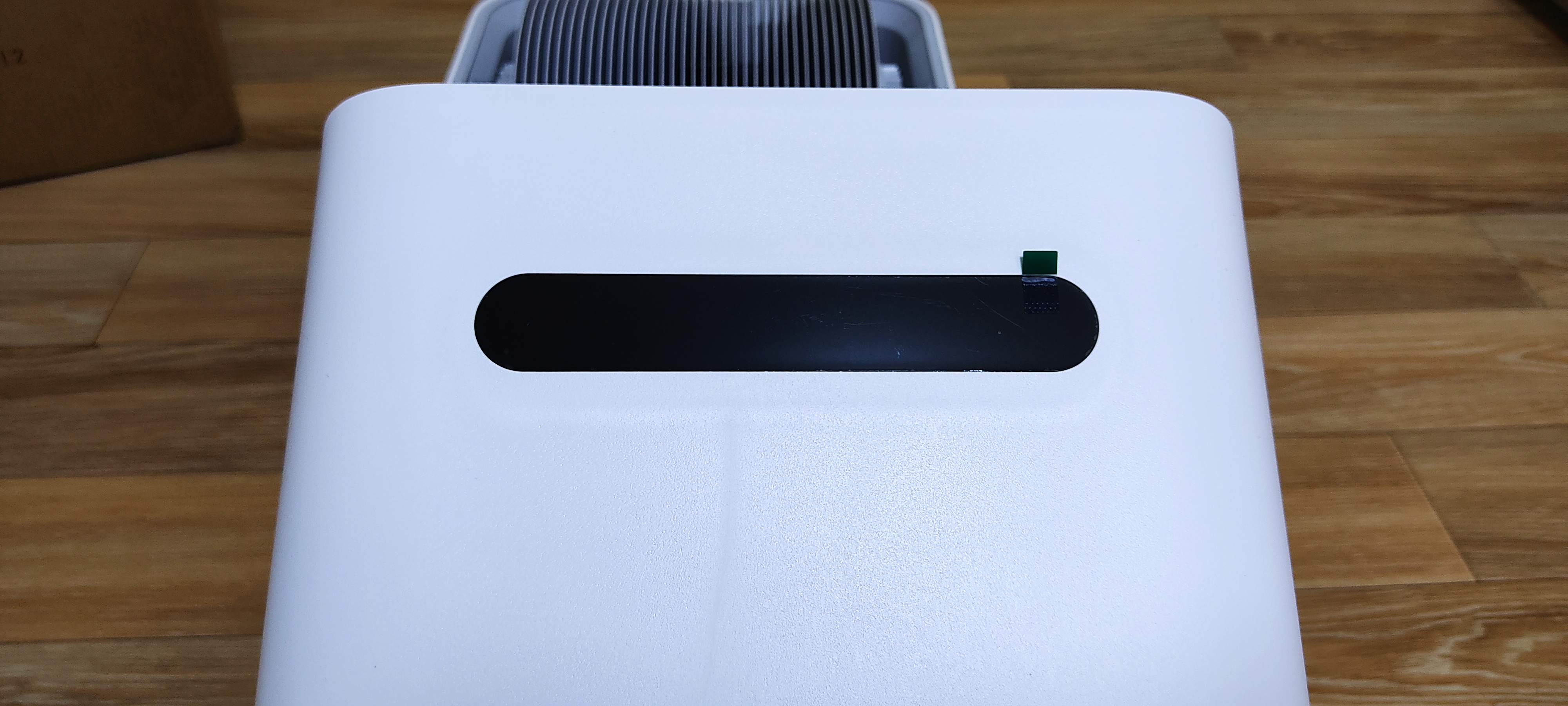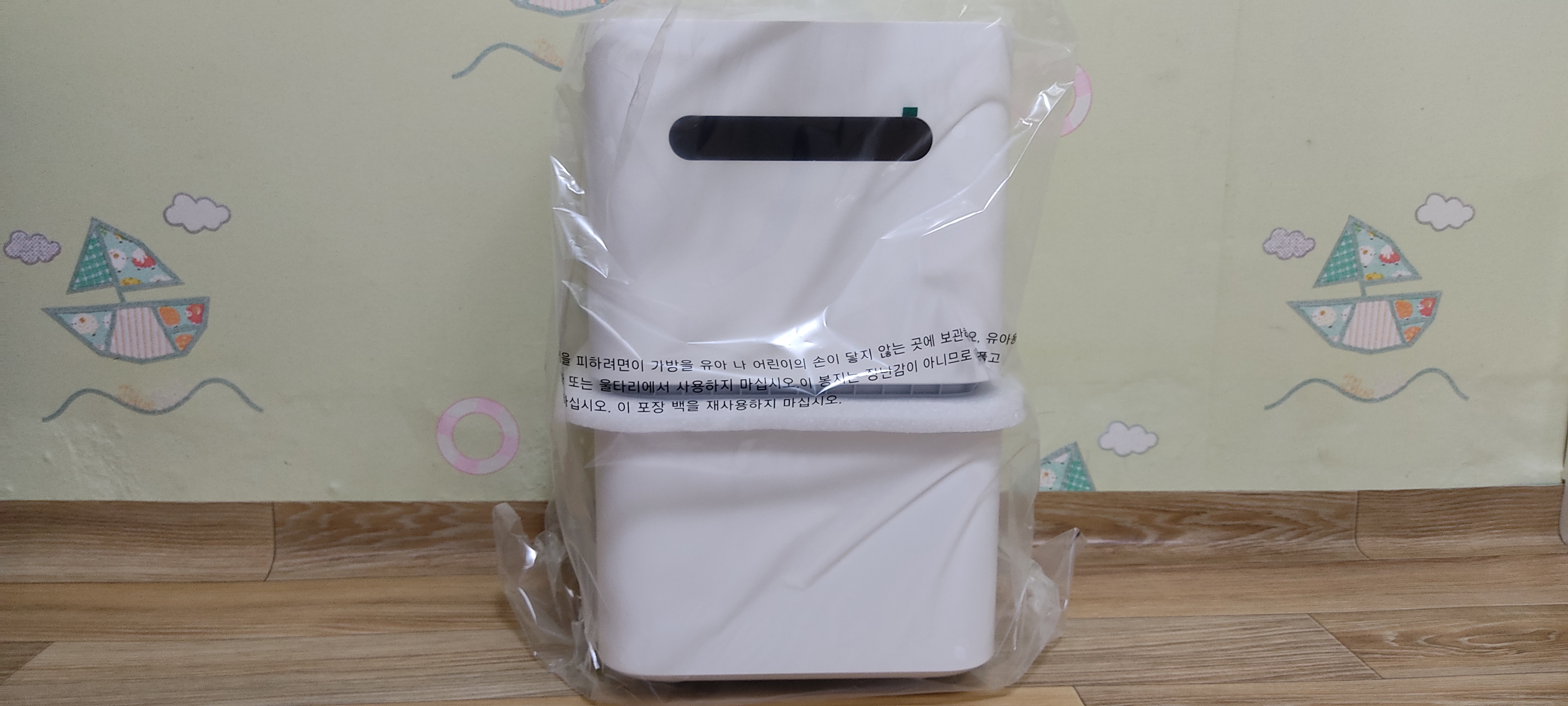 박스에서 제품을 꺼내 살펴 봤습니다. 흰색에 깔끔한 디자인으로 집안 어디에 놓아도 괜찮을거 같네요. 사용전 주의 사항이 제품 상단에 써 있습니다. 사용전에 반드시 물탱크와 증발판 밑의 완충패드를 꺼내라고 써 있습니다. 완충패드는 배송과정에서 파손을 막기 위해 들어가 있는거 같습니다.