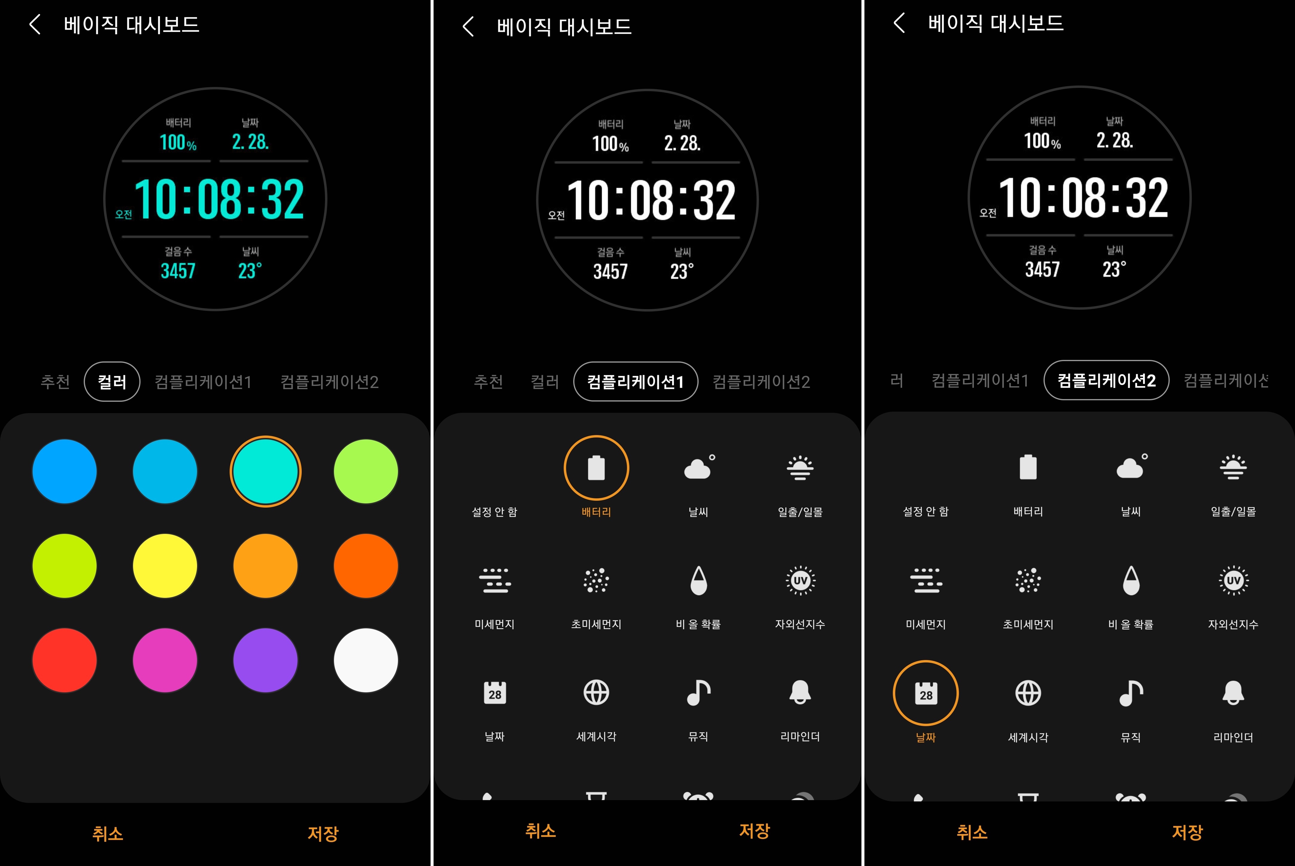 워치페이스의 경우 종류는 물론 세부적인 설정도 변경이 가능합니다. 가운데 시간을 제외하고 상단과 하단에 들어가는 정보를 사용자 원하는데로 변경할 수 있습니다. 배터리 잔량은 물론 날씨, 미세먼지, 비올 확률 등 날씨 관련도 있습니다. 운동을 자주하는 분들은 운동으로 설정할 수 있습니다.