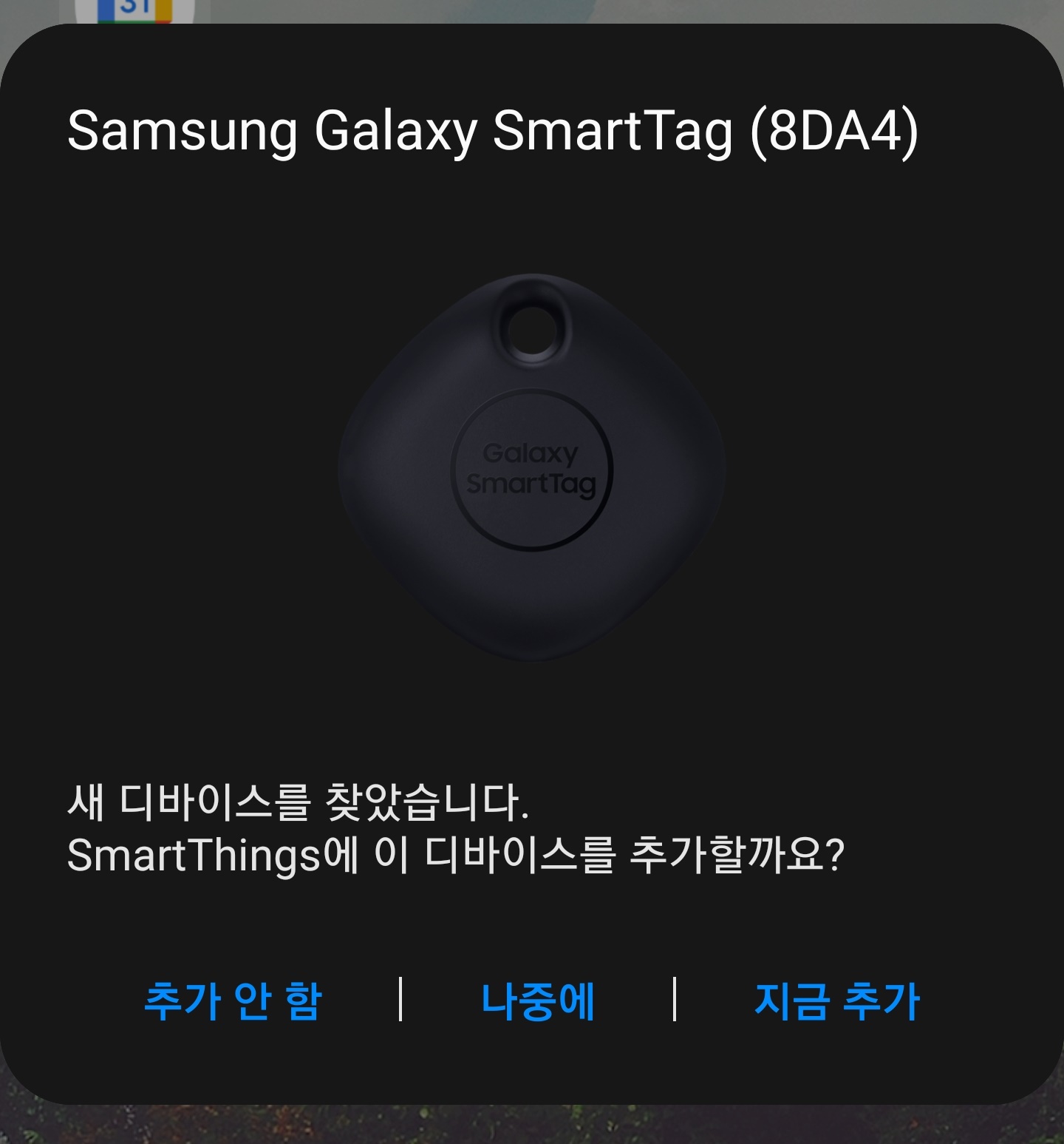 처음에 스마트폰과 연결을 하기 위해 중앙 버튼을 눌러줘야 합니다. 버튼을 눌러주니 갤럭시 S21 울트라에서 팝업 화면이 나옵니다. 지금추가를 누르면 바로 연결이 됩니다.