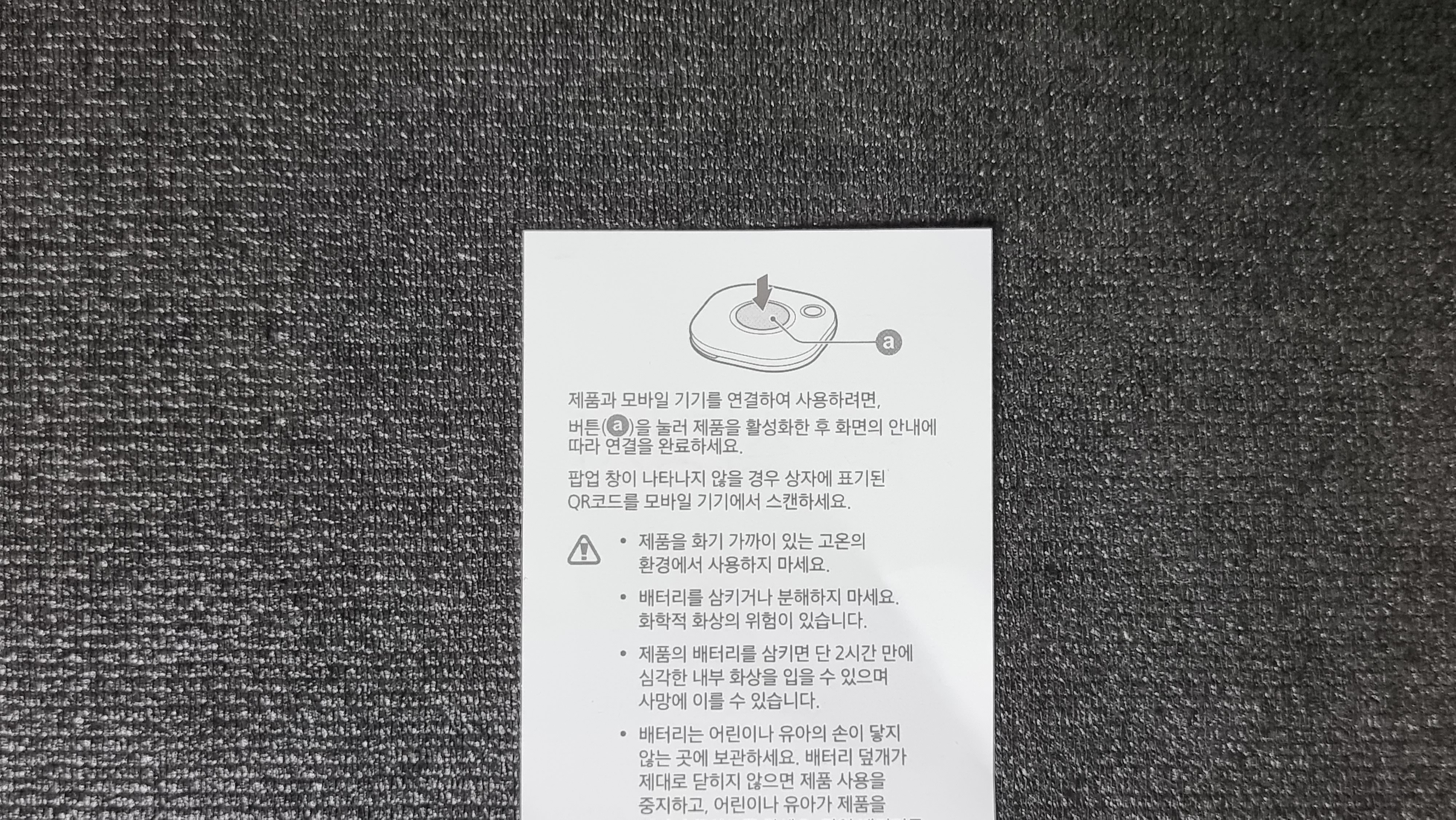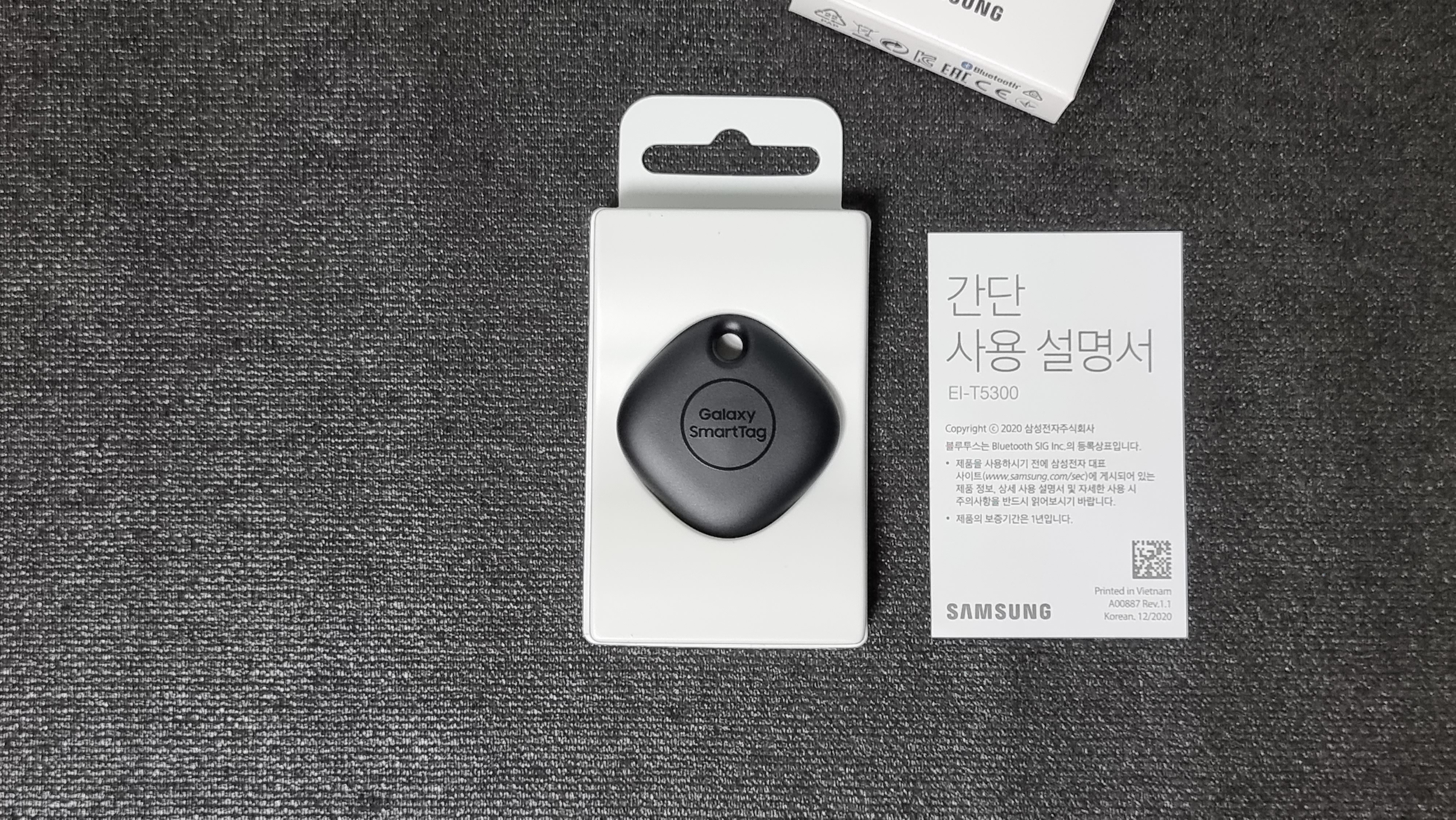 갤럭시 스마트태그 박스는 아주 작습니다. 박스를 열어 보면 제품과 설명서가 끝입니다. 가방에 연결할 수 있는 열쇠고리 같은게 같이 동봉되어 있으면 좋을거 같다는 생각이 드네요.