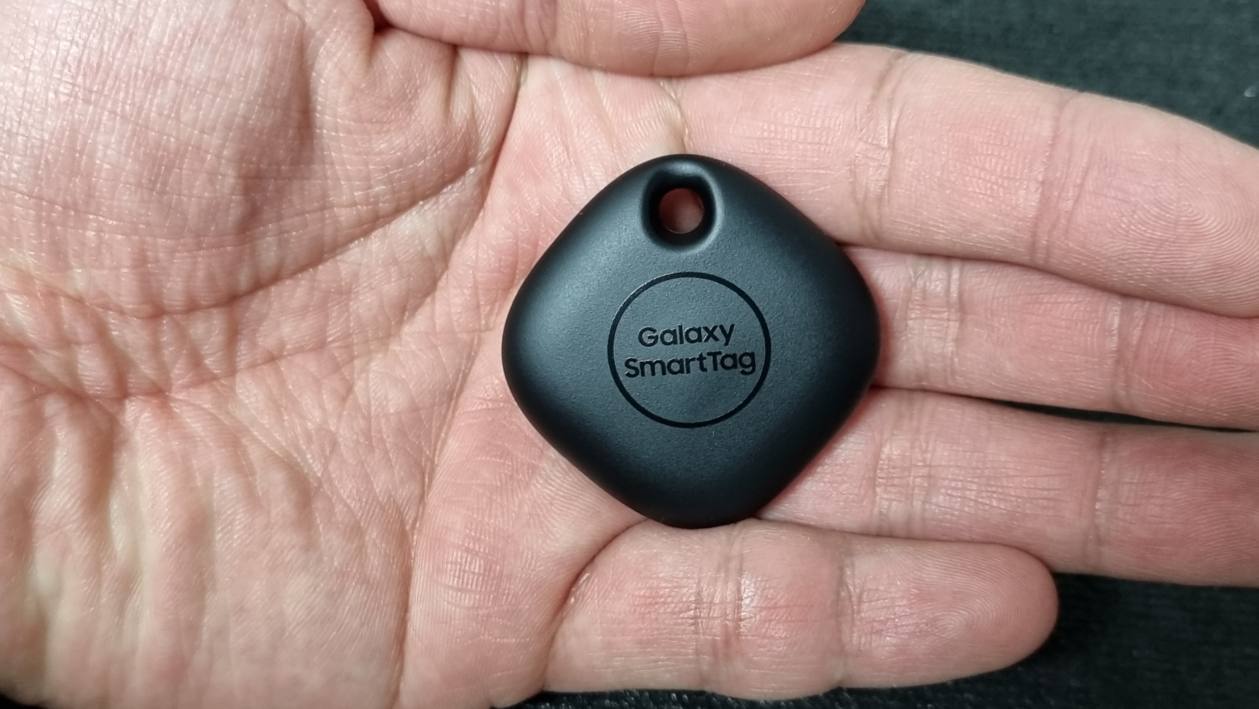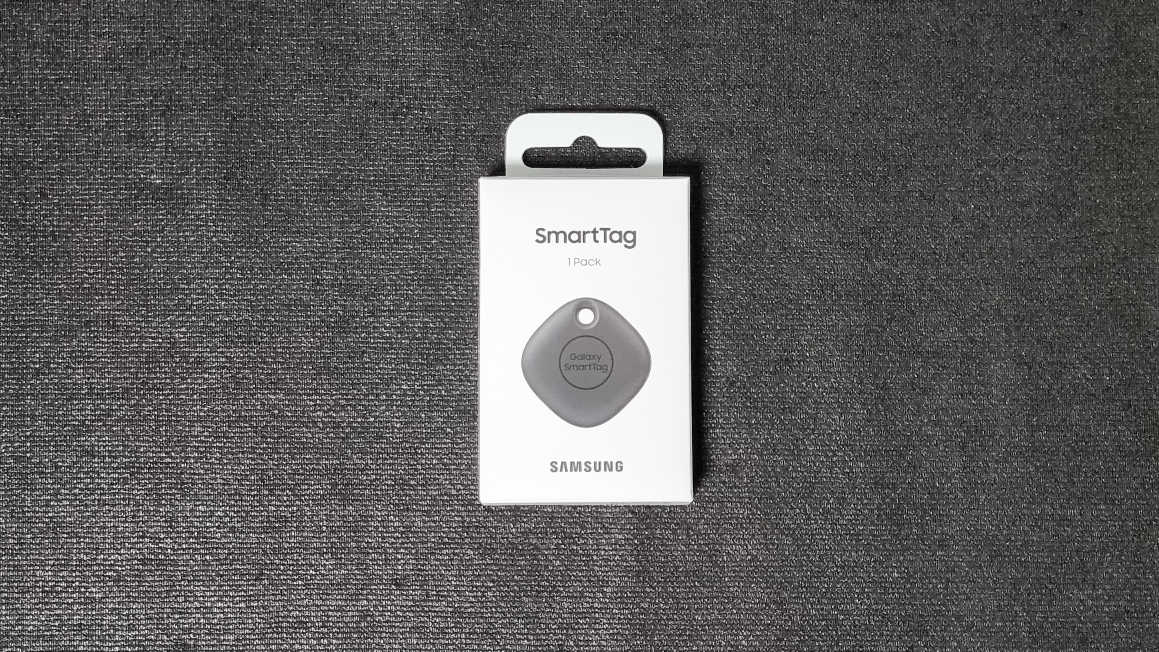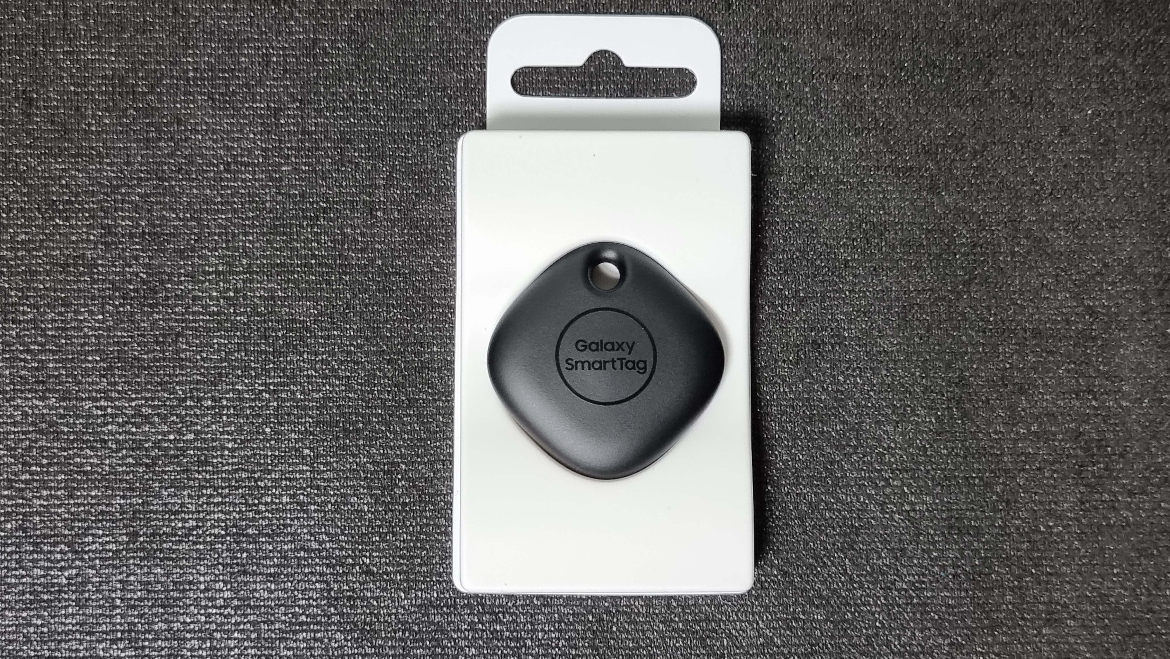 네모난 모양에 제품 중앙에 Galaxy SmartTag라고 써있는데, 이곳이 버튼입니다. 위쪽에는 열쇠고리 등을 연결할 수 있는 구멍이 있습니다. 사이즈는 39.1 x 39.1 x 10.4mm이며, 무게는 13g입니다.