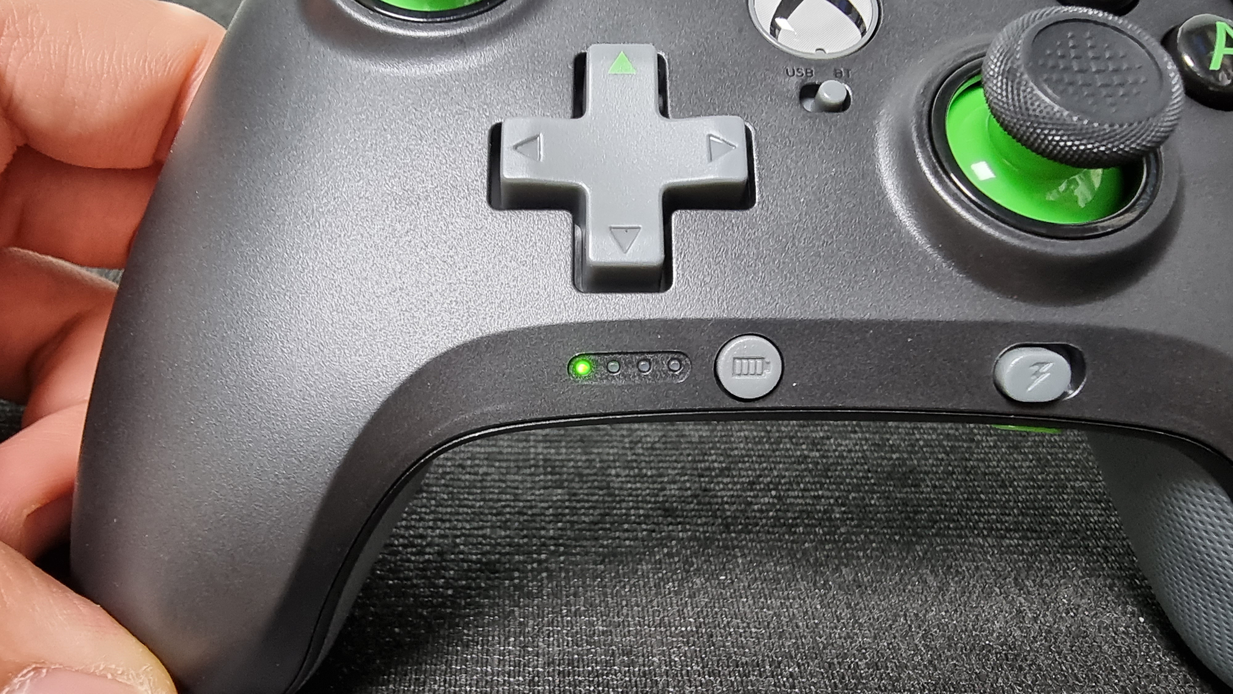 방향키 아래에는 배터리 잔량 LED가 있습니다. 참고로 게임패드로 스마트폰 등을 충전하는 보조배터리 역활도 가능합니다. LED배터리 표시 옆에 충전 모양 버튼을 옆으로 하면 핸드폰 충전을 할 수 있습니다. 스마트폰으로 게임을 하다 배터리가 없을 때 충전을 하면서 게임을 즐길 수 있습니다.