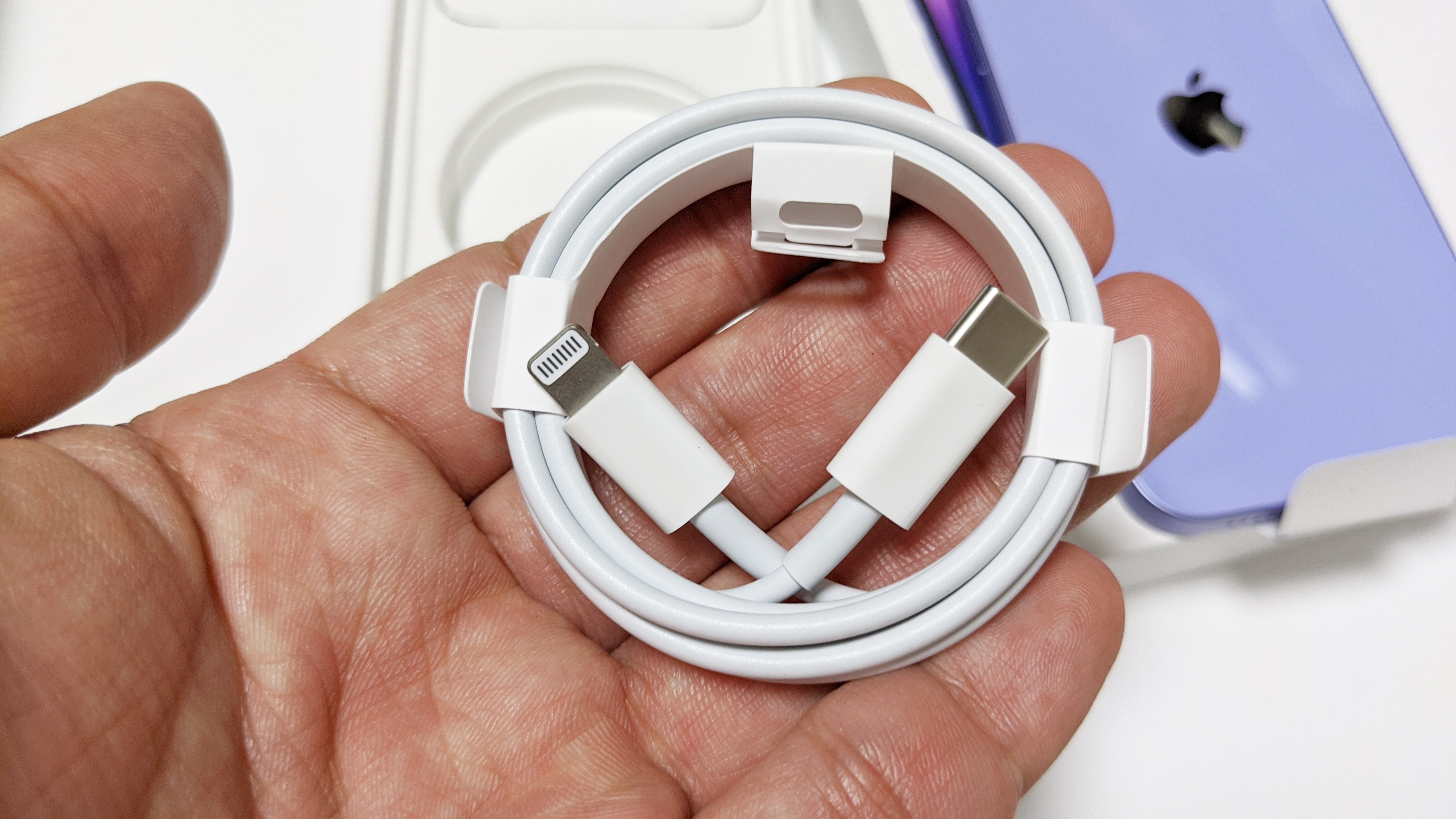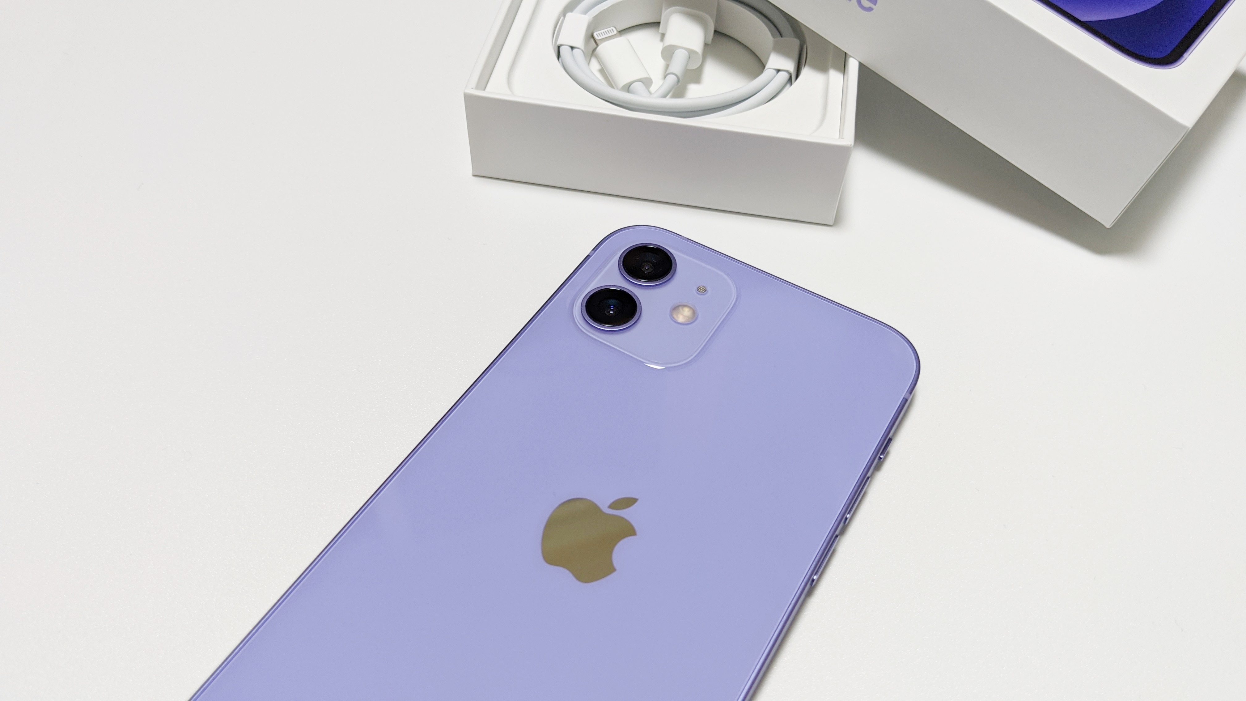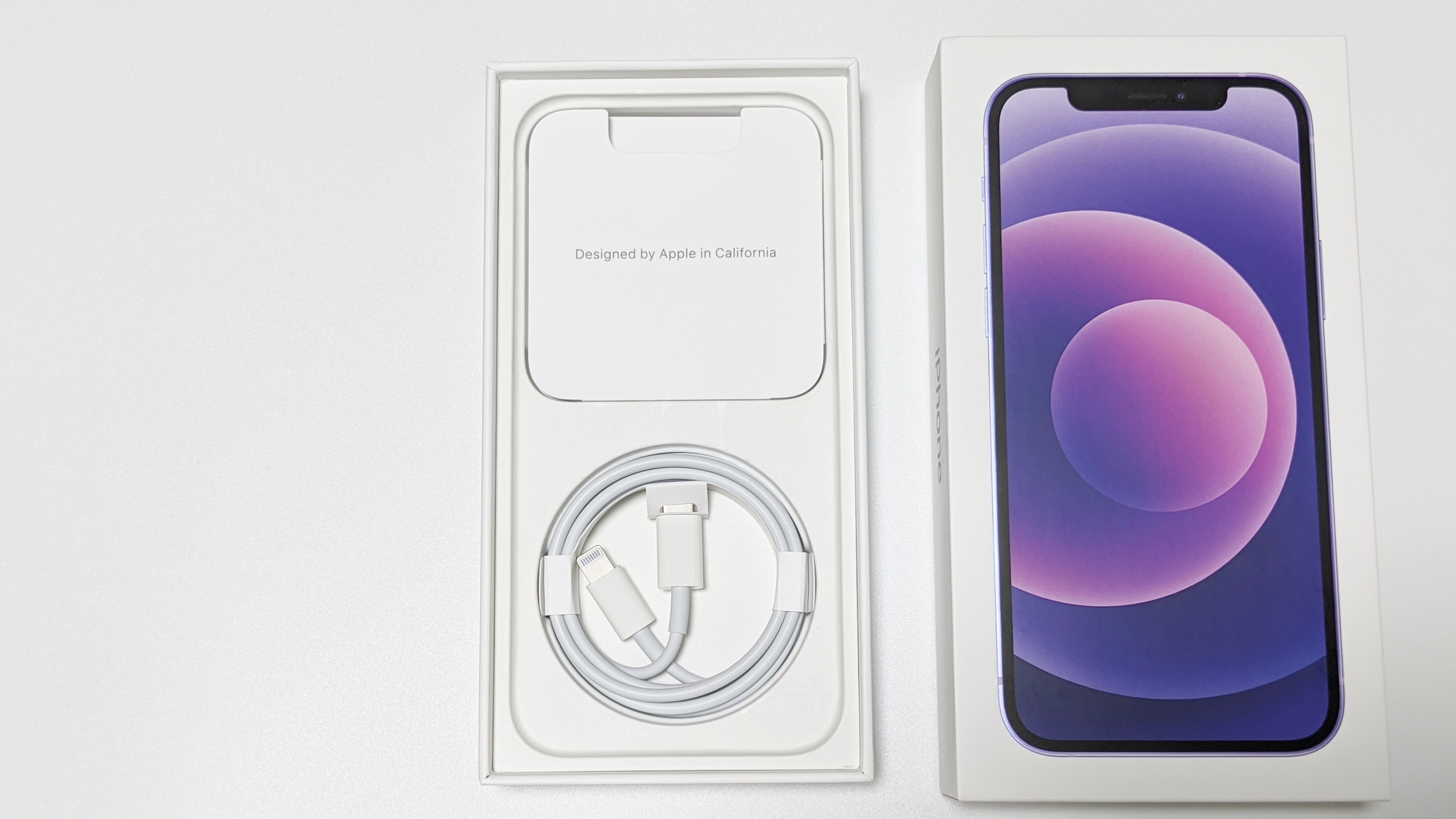 얼마전 아이폰12를 개봉해봐서 새로운 느낌은 없고, 오직 퍼플 색상만 눈에 들어오네요. 구성품을 간단하게 설명드리면 설명서, 애플 스티커, 타입 C to 라이트닝 케이블이 들어 있습니다. 아이폰11에선 일반 모델엔 타입 A to 라이트닝 케이블이 들어가고, 프로 모델에만 타입 C to 라이트닝 케이블이 들어갑니다. 전에 개봉할 때는 몰랐는데, 아이폰12 일반 모델에도 타입 C to 라이트닝 케이블이 들어가네요.