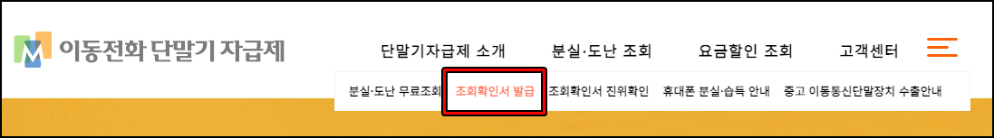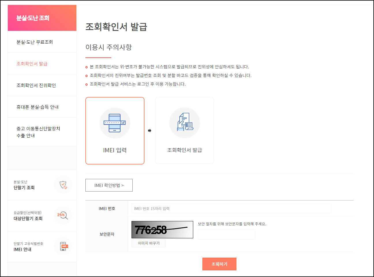 분실·도난 확인서 발급도 가능합니다. 확인서를 발급받기 위해선 회원가입을 먼저 해야 합니다. 회원가입을 완료한 후에 상단 분실·도난 조회 메뉴에서 조회확인서 발급을 눌러주세요. 그리고 IMEI번호를 입력후 조회 확인서 발급을 눌러주면 됩니다.