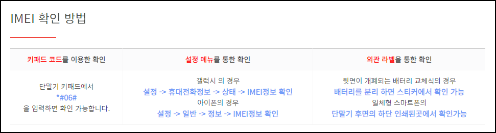 IMEI 번호 확인은 키패드 코드를 통해 확인하는 방법 / 설정 메뉴를 통해 확인하는 방법 / 핸드폰 뒷면이나 박스에 붙어 있는 IMEI 번호 확인하는 방법이 있습니다. 핸드폰 기종별로 차이가 있을 수 있습니다.