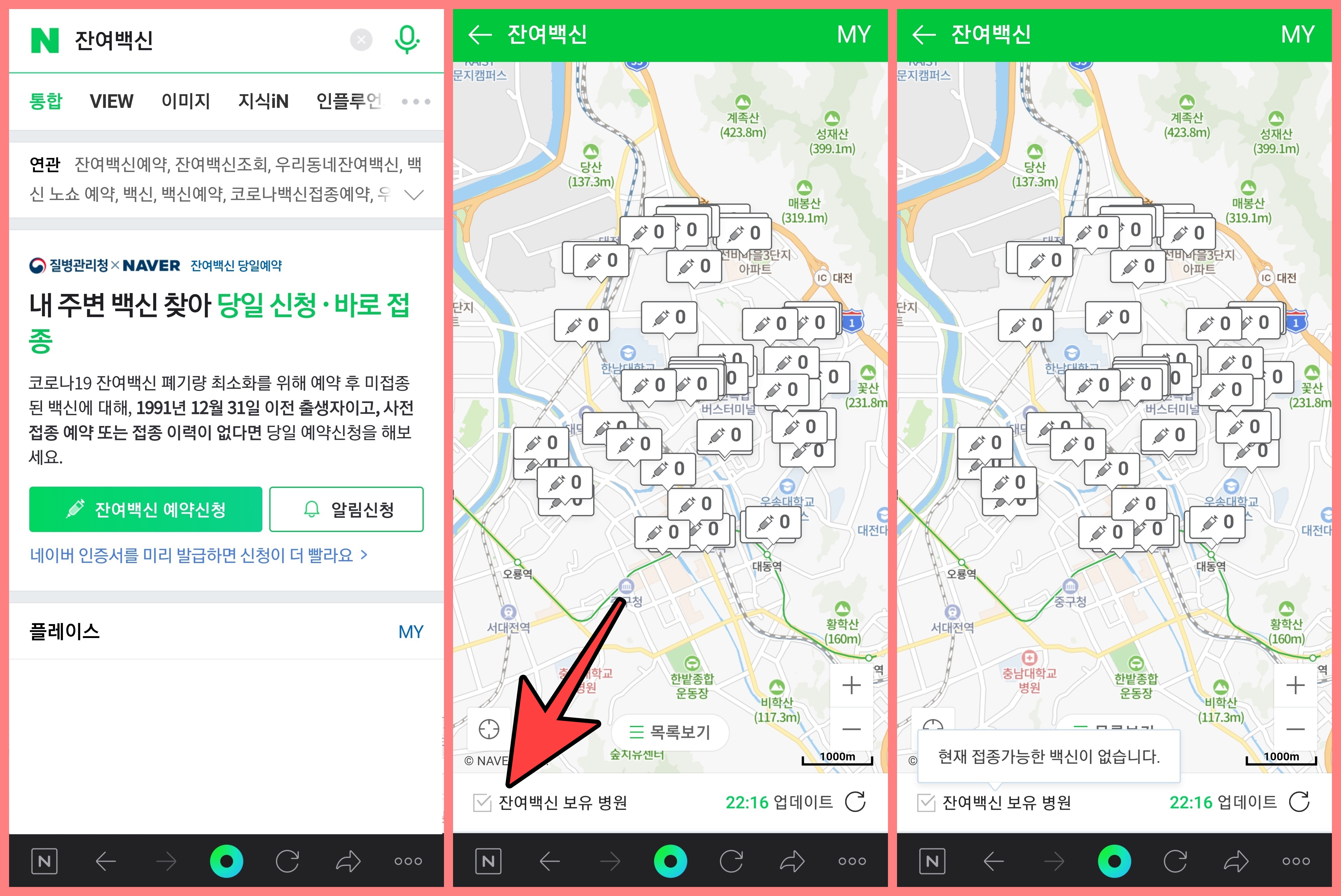 네이버 잔여백신을 예약하기 위해선, 네이버 인증서가 필요합니다. 본인 인증을 거치면 1분안에 빠르게 네이버 인증서를 발급받을 수 있습니다. 인증서 발급이 끝나면 네이버에서 잔여백신을 검색해 주세요. 잔여백신 예약신청에 들어가면 지도가 나오고 잔여백신 수량을 확인할 수 있습니다.
