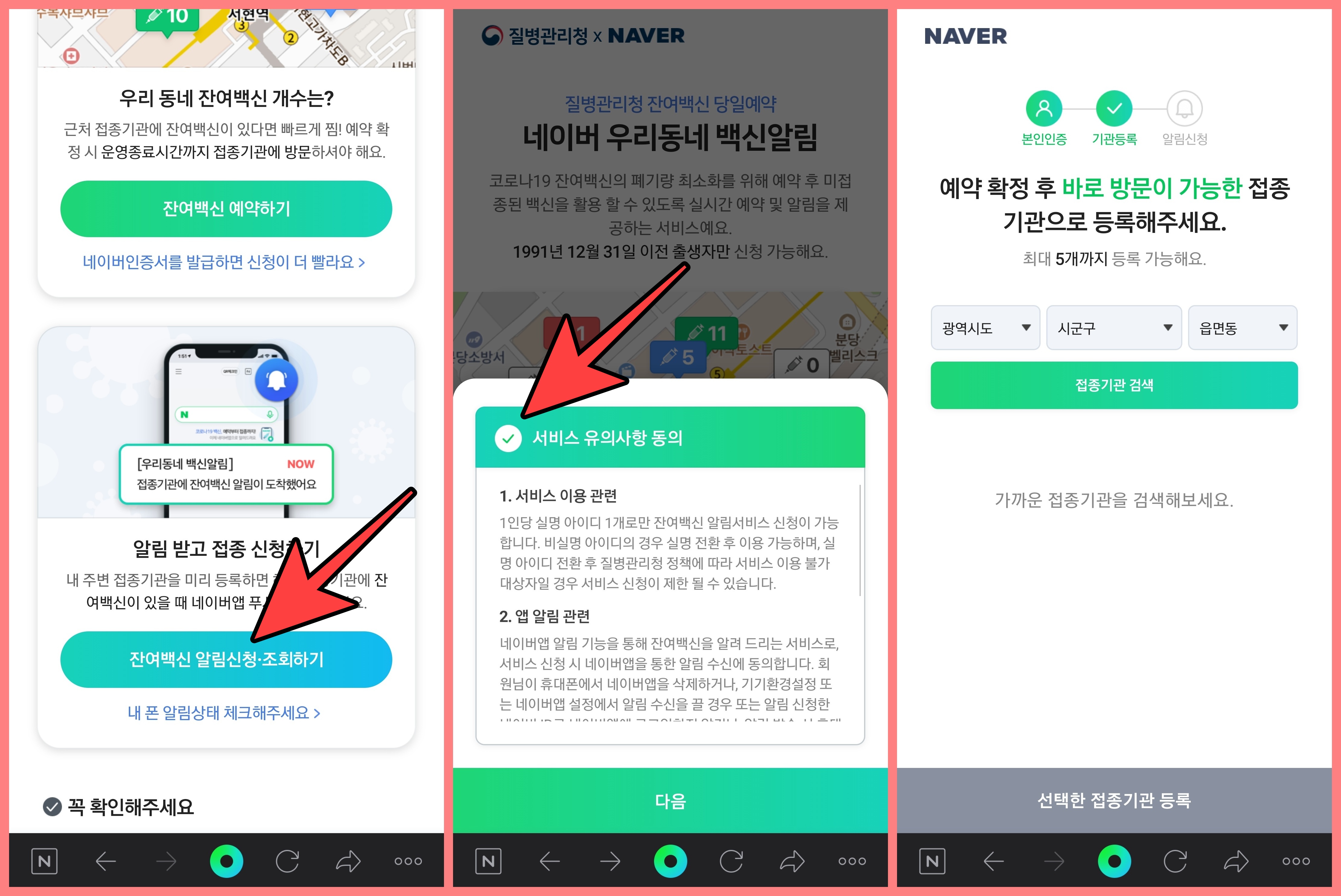 실시간으로 계속 확인해도 되지만, 알림신청이 가능합니다. 지도 화면에서 목록보기를 하거나, 네이버에 잔여백신 검색을 하면 나오는 알림신청에 들어가주세요. 서비스 유의 사항을 읽어 보고 동의를 눌러주면 됩니다.