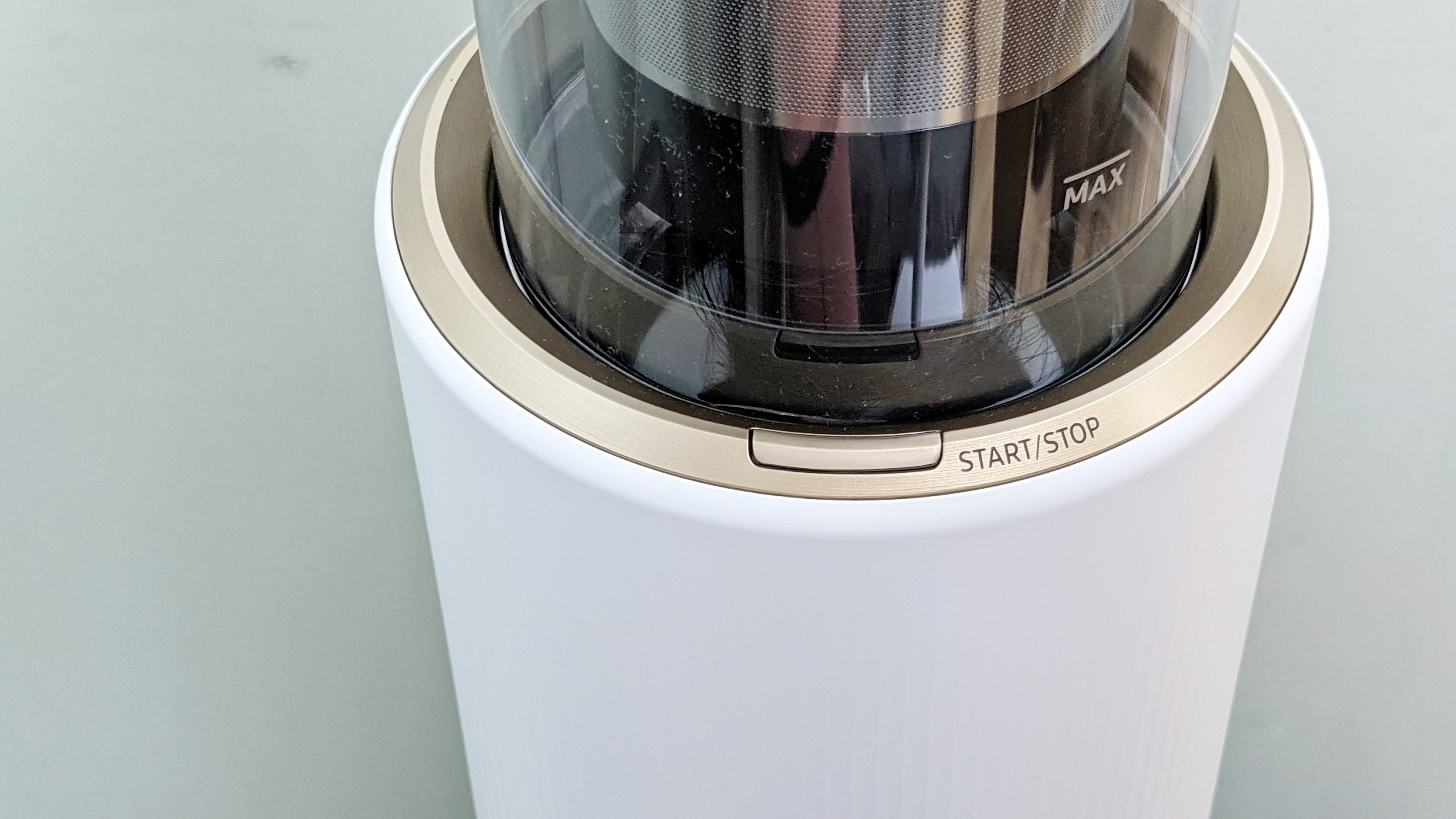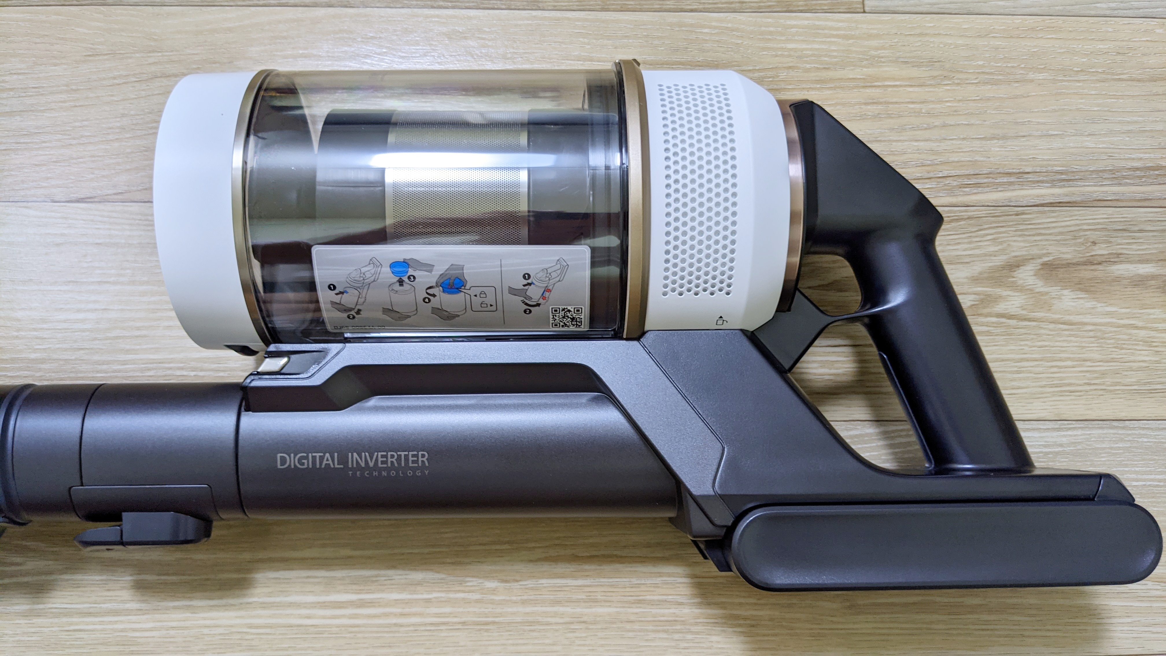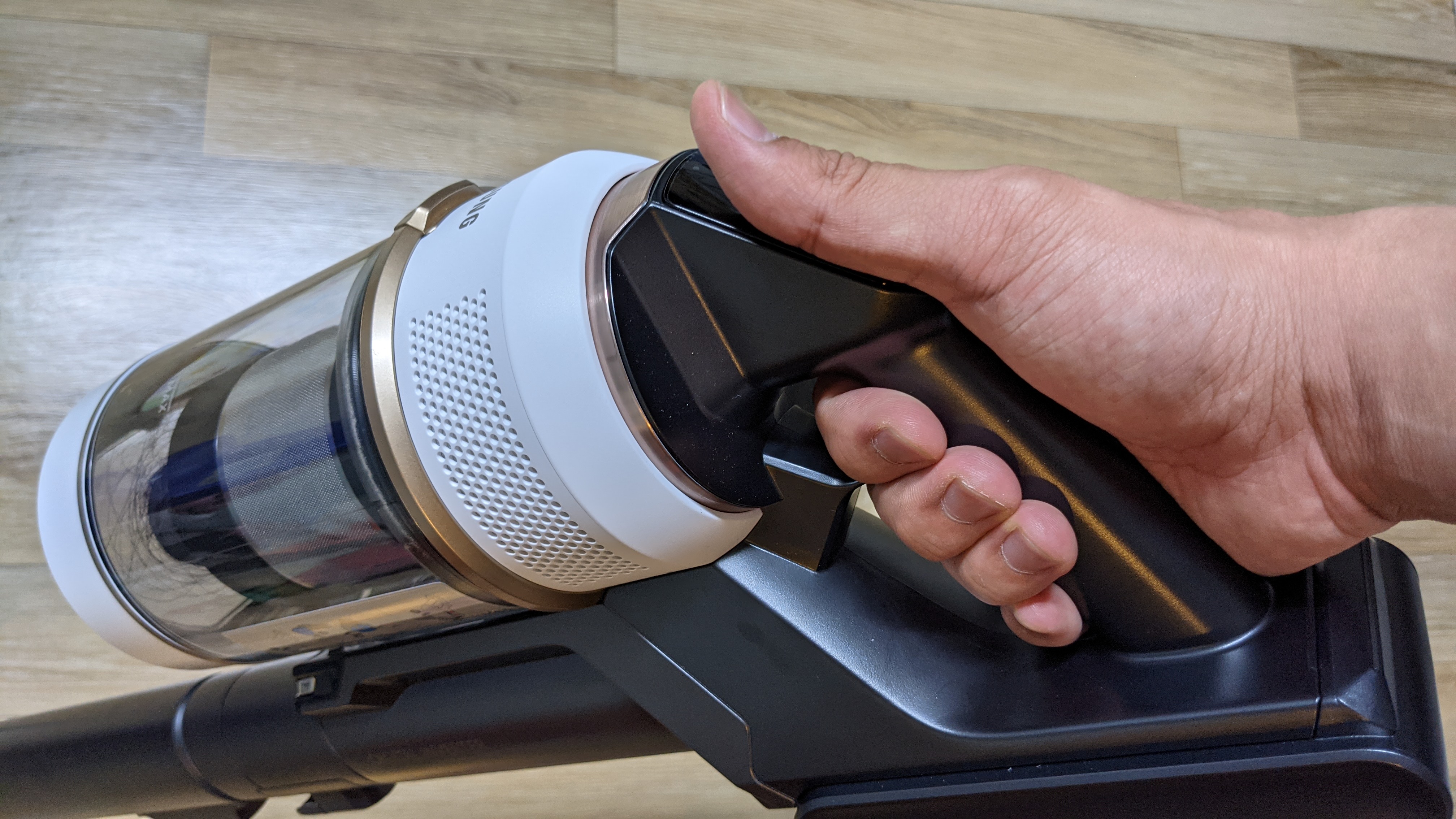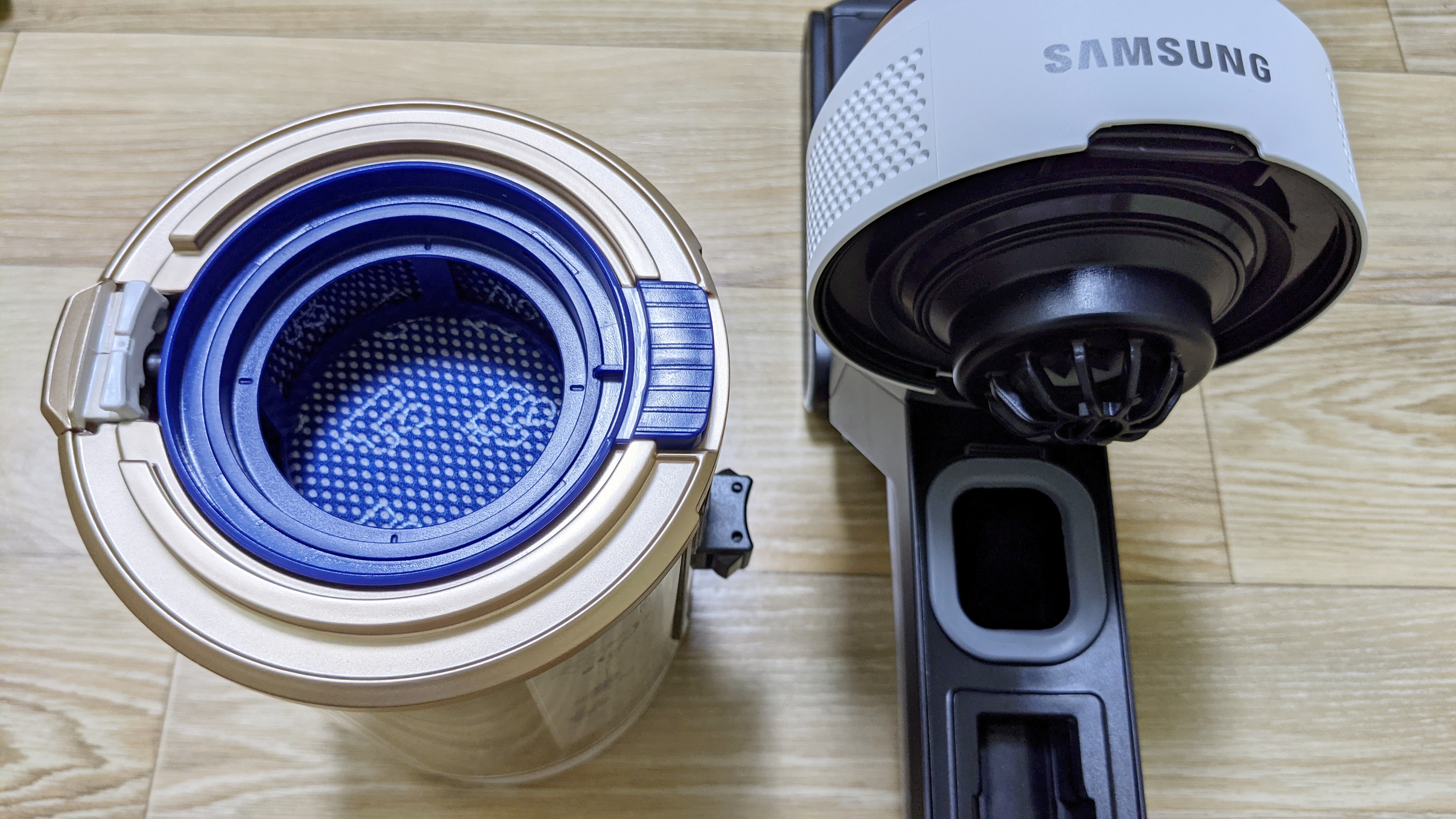 LG 무선청소기를 구입하지 않은 이유가 먼지통이 분리되지 않아서 입니다. 비스포크 제트의 먼지통부분인데, 중앙에 버튼을 누르면 먼지통을 별도로 분리할 수 있습니다. 먼지통은 물로 필터도 물세척을 할 수 있습니다.