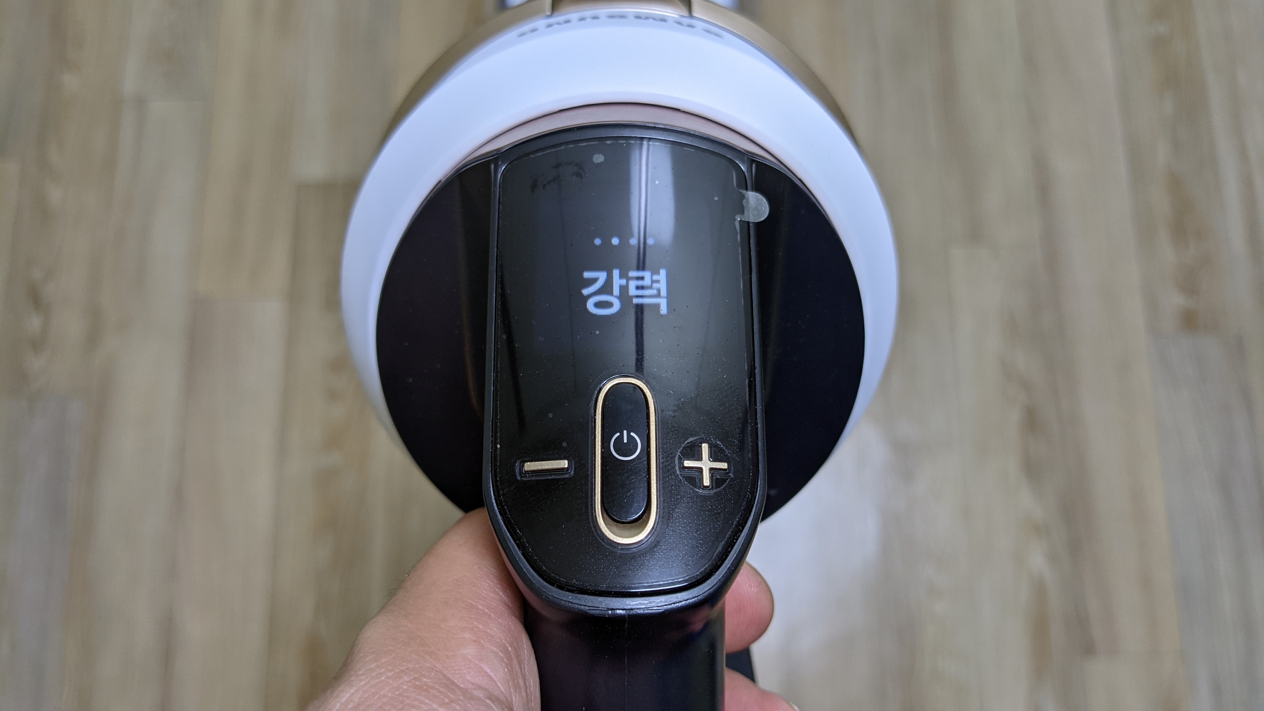 청소기 손잡이 쪽에 버튼과 디스플레이가 있습니다. 다이슨의 경우 손잡이 부분에 버튼을 계속 눌러주면서 청소를 해야하지만, 비스포크 제트는 버튼을 한 번만 눌러주면 됩니다. - +를 통해 흡입강도를 조절 할 수 있습니다. 청소 흡입단계과 남은 사용시간은 디스플레이를 통해 바로 확인할 수 있습니다.
