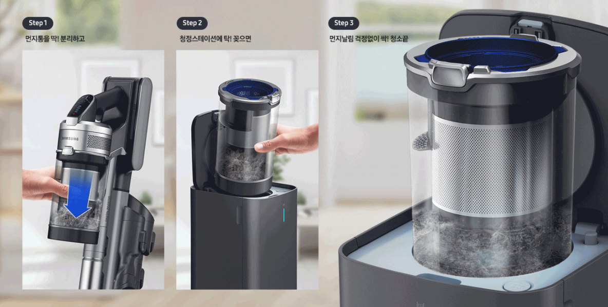 그런데 삼성 제트는 일반과 비스포크 두가지가 있으며, 비스포크가 신형입니다. 구형의 경우 먼지를 비우기 위해선 먼지통을 때서 청정스테이션에 연결해줘야 합니다. 신형은 충전과 거치를 하면서 먼지통을 비울 수 있게 청정스테이션이 설계되어 있습니다. 당연히 신형이 편리한데, 가격이 20만원 정도 차이가 납니다. 가성비로 가느냐 편리함으로 가느냐 많은 고민을 하다 그래도 신형이 좋지라는 생각에 신형으로 구입했습니다.