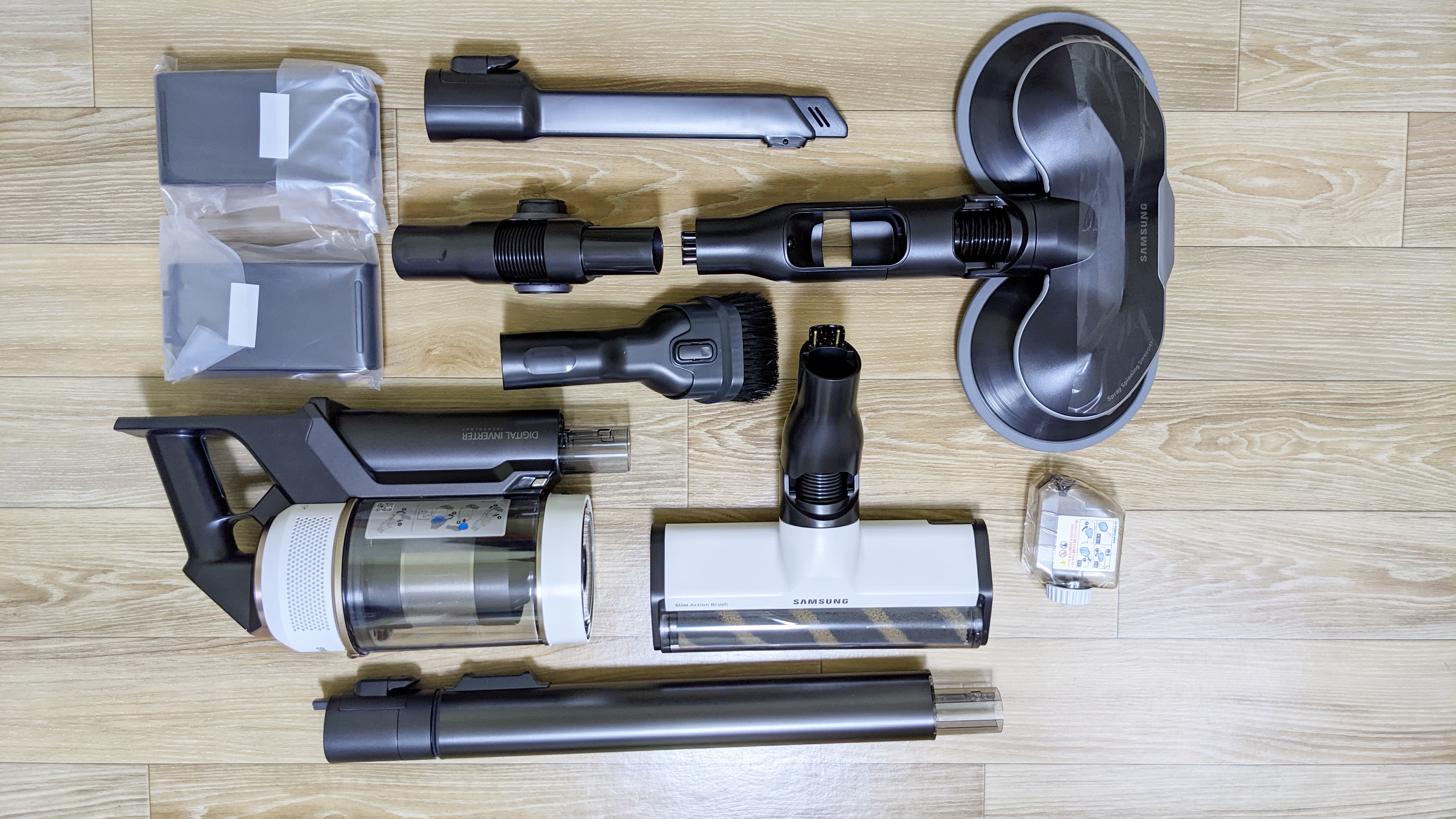박스에 들어있던 것을 잘 정리해봤습니다. 물걸레만 3종류가 들어가 있습니다. 구성품을 하나 하나 살펴보면 청소기 본체, 청소기 대, 일반 브러시, 물통, 물걸레 브러시, 틈새브러시, 솔브러시, 플렉스연장관, 배터리2개입니다. 아직 청정스테이션이 들어 있는 박스를 열지도 않았는데, 마음이 부자가 된거 같네요.