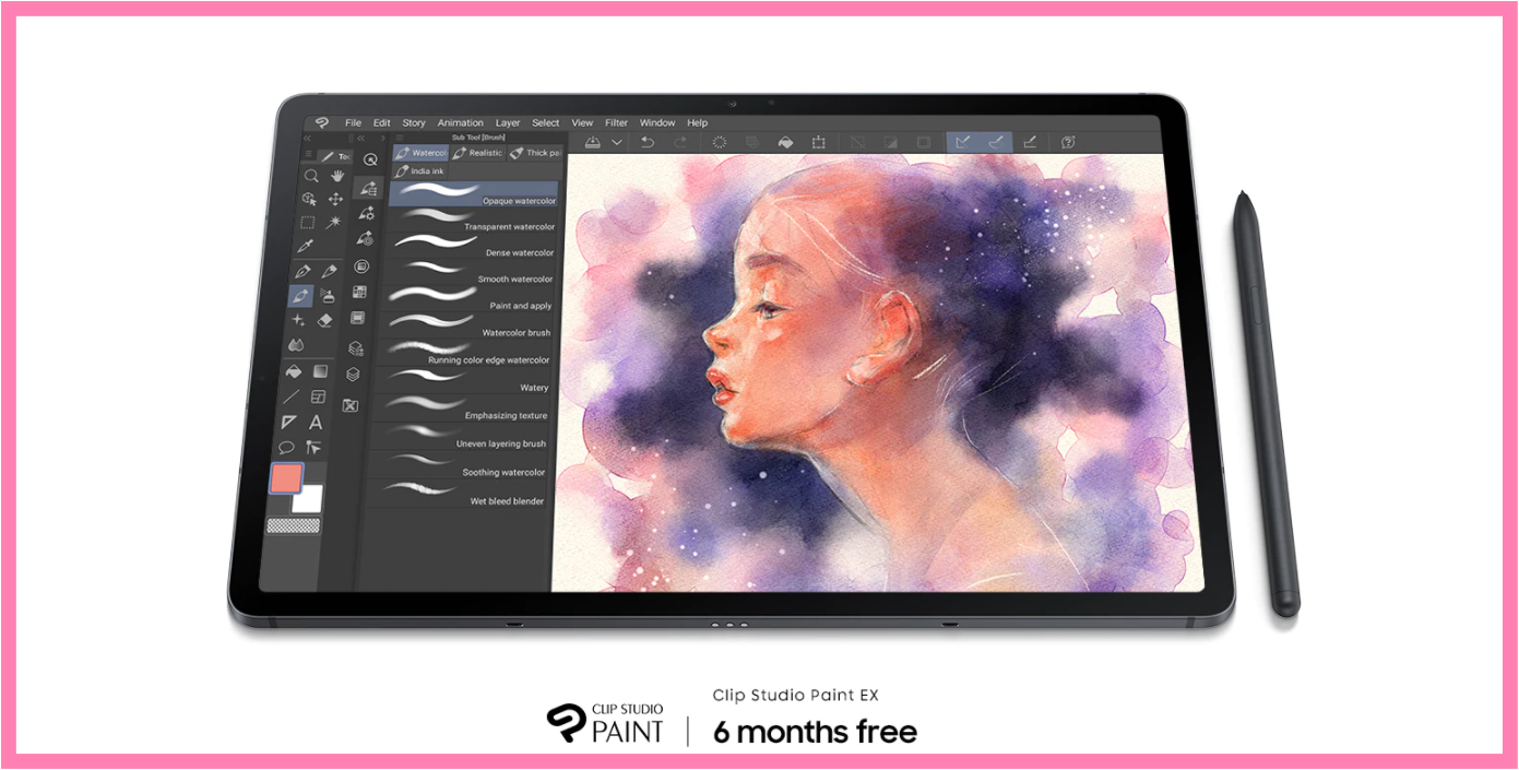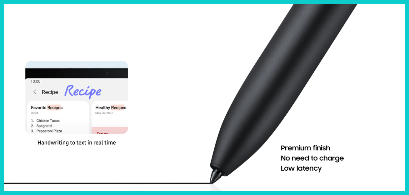 갤럭시탭 S7 FE도 S펜을 지원합니다. 사진을 보면 S펜은 후면에 부착하는 것으로 보입니다. 색상은 미스틱 블랙, 미스틱 실버, 미스틱 그린, 미스틱 핑크 4가지가 있습니다.