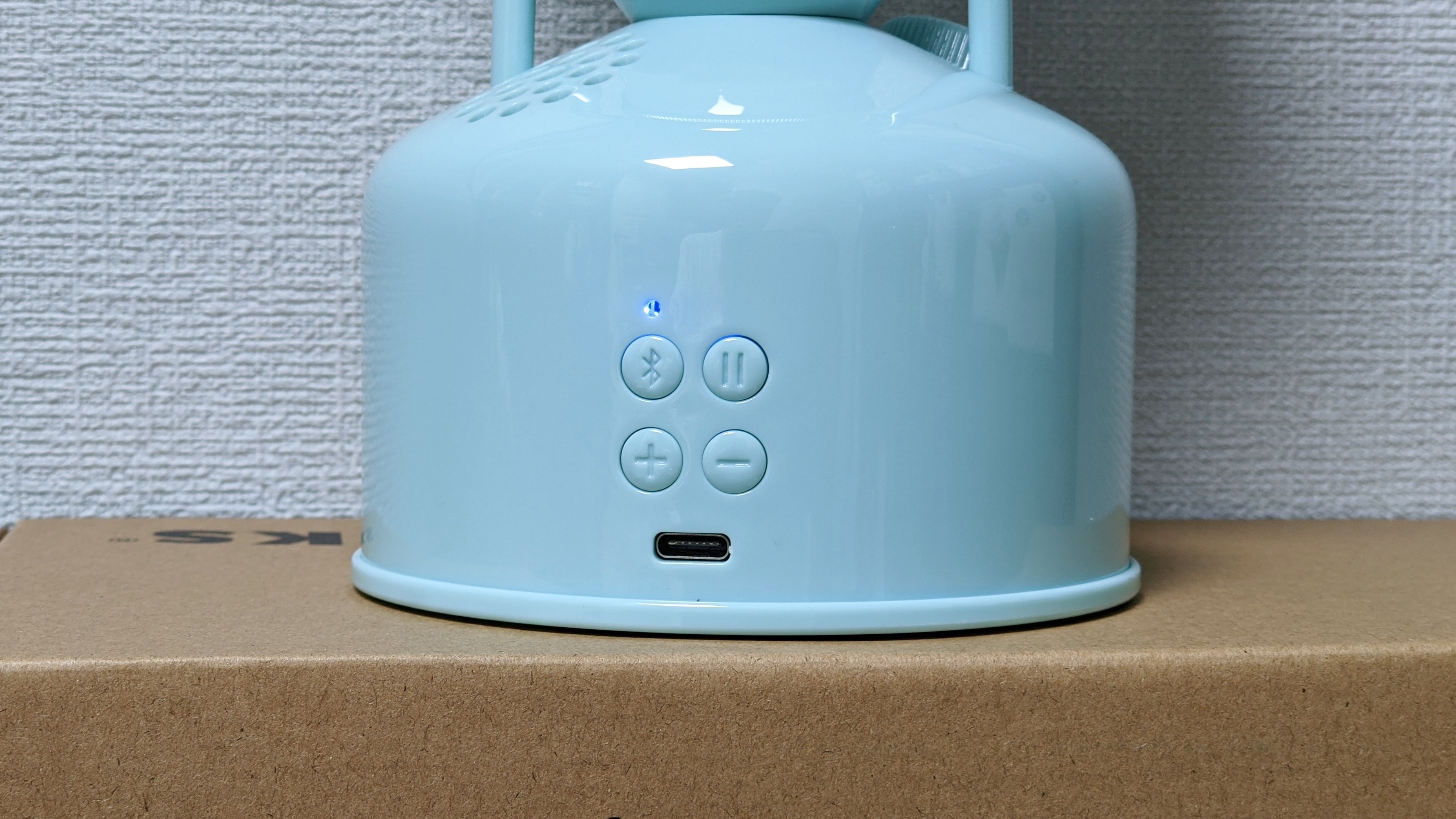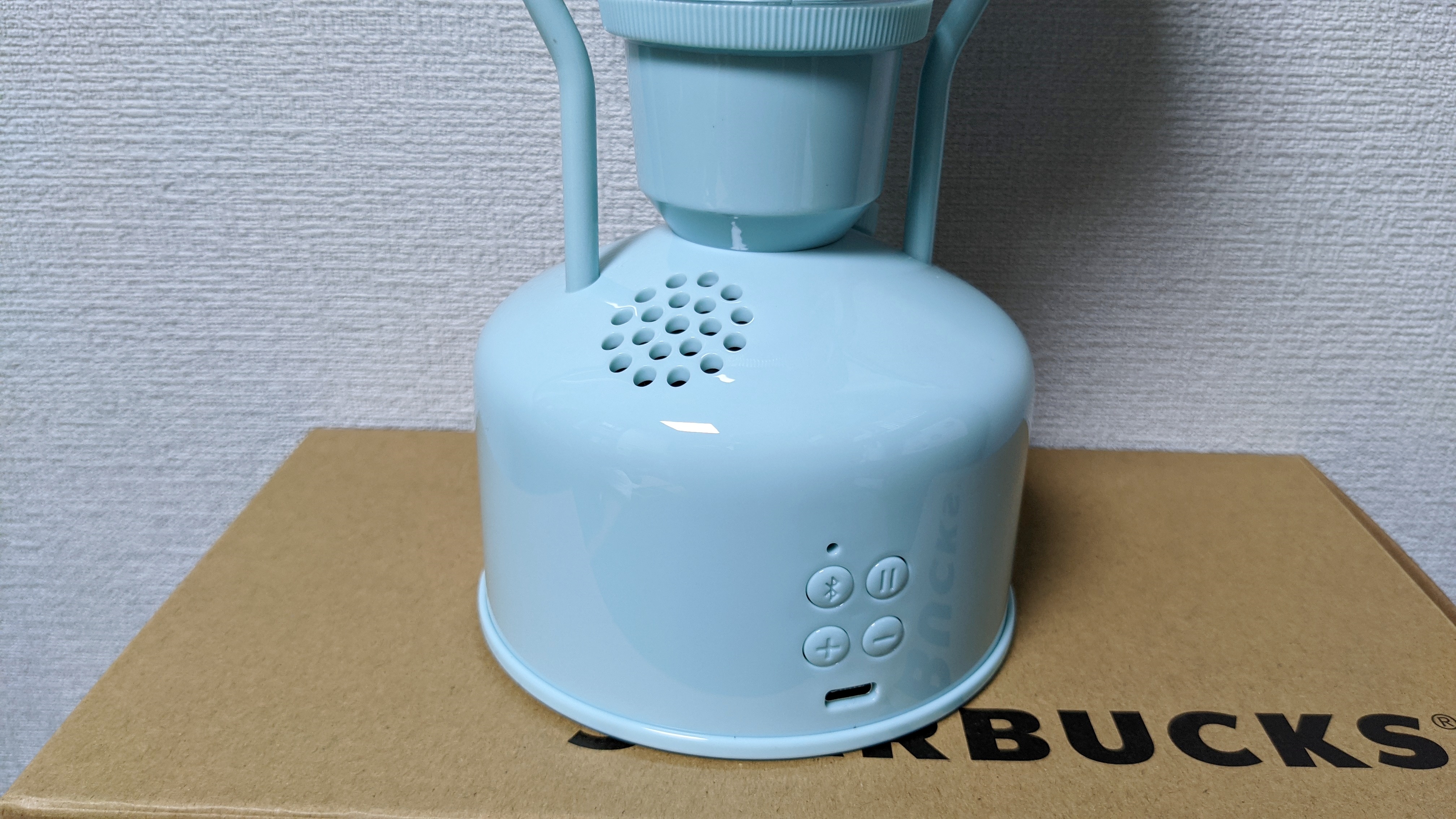 제품 중간에 스피커가 있고 뒤쪽엔 다양한 버튼이 있습니다. 블루투스 버튼으로 전원을 켜고 끌 수 있습니다. 그리고 노래를 멈추거나 재생할 수 있는 버튼과 볼륨을 올리고 내리는 버튼이 있습니다. 스타벅스 랜턴에 크게 관심이 없어서 인지, 블루투스 스피커 기능이 들어간다는 것을 제품 뒤쪽 버튼을 보고 알았습니다.