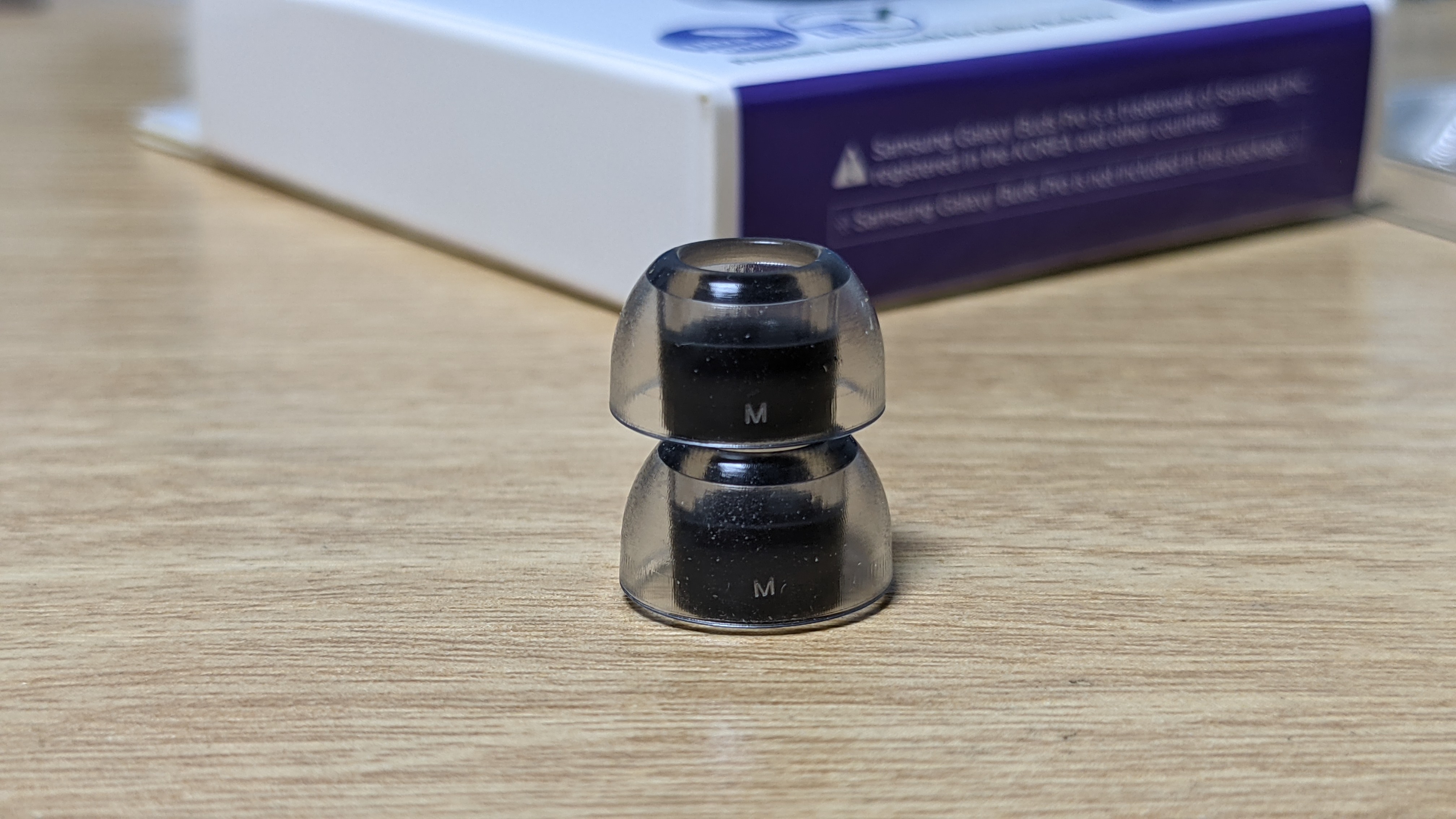 이어팁 색상은 겉에는 반투명이고 버즈 프로와 연결하는 부분은 검정색으로 되어 있습니다. 이어팁을 손으로 만지면 갤럭시 버즈 기본 이어팁보다 단단하단 느낌을 줍니다.