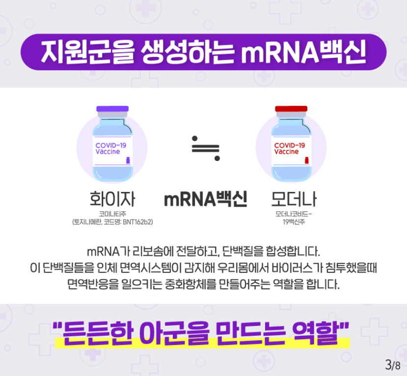 mRNA백신은 바이러스 유전정보가 담긴 mRNA를 사람몸에 주입하여 체내에서 항원(바이러스 단백질)이 만들어지게하여 면역체계가 항체를 만들도록 유도하는 방식입니다. 해외 임상실험에서 화이자는 95%, 모더나는 94.1%까지 예방 효과가 있는 것으로 나왔습니다. 기존 백신과 다르게 바이러스를 직접 사용하지 않아 감염 우려가 없고, 기존 백신에 비해 신속하게 대량생산이 가능한게 장점입니다.