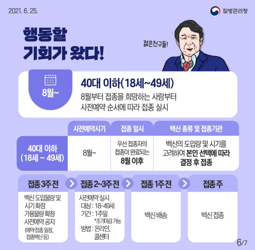 그럼 2040의 경우 백신을 언제 맞을 수 있을까요? 백신 공급 상황에 따라 변동이 있을 수 있지만 8월 26일부터 9월 30일까지 접종을 할 예정입니다. 백신 종류는 화이자 또는 모더나에서 만든 mRNA 백신을 맞습니다.