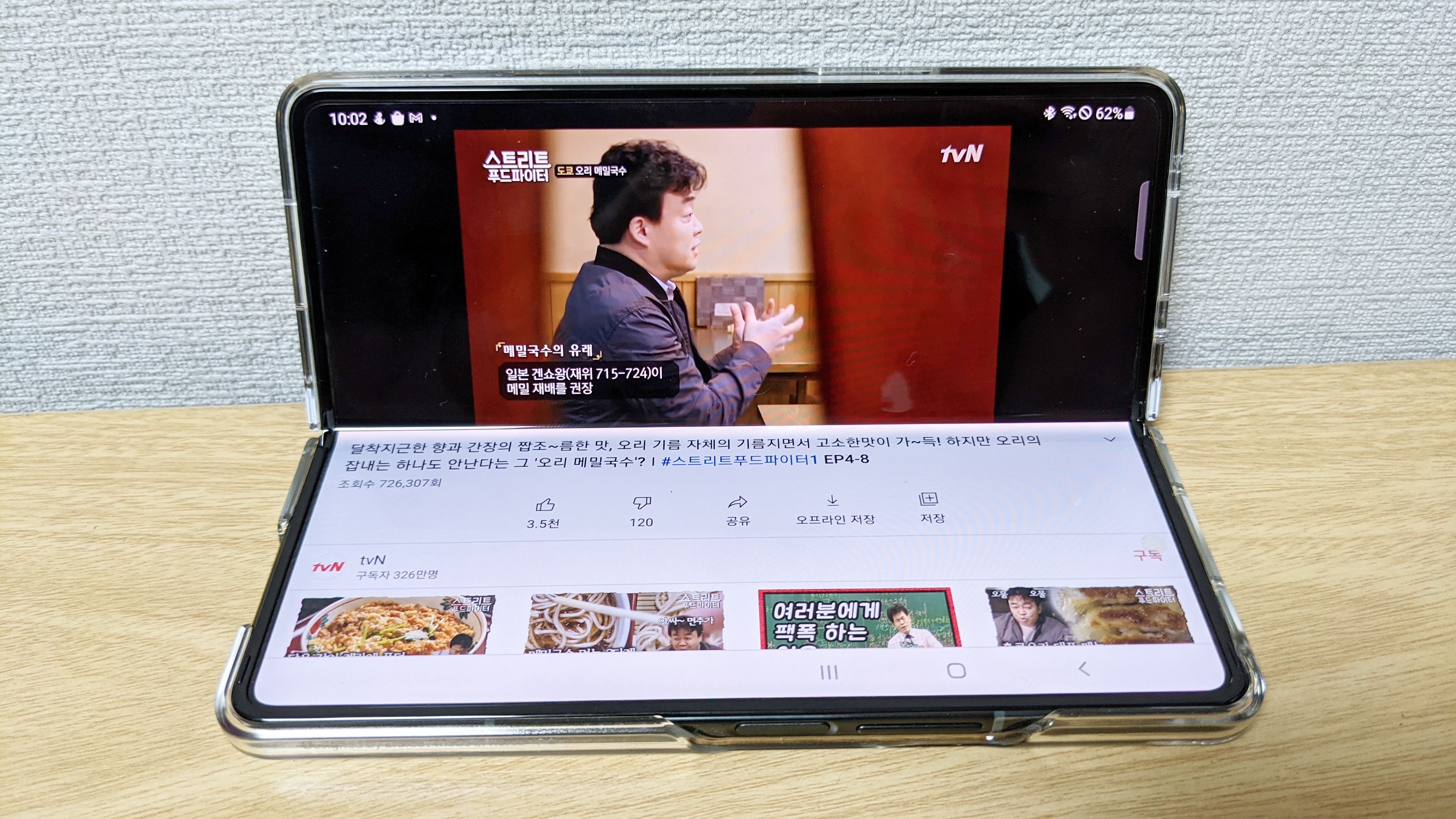 그리고 반쯤 접어 놓고 활용도 할 수 있습니다. 유튜브를 보다 화면을 접으면 위와 같이 화면분할을 자동으로 해줍니다. 웨이브 앱도 영상을 보다 접어 봤는데, 위와 같은 화면 전환이 되진 않았습니다.