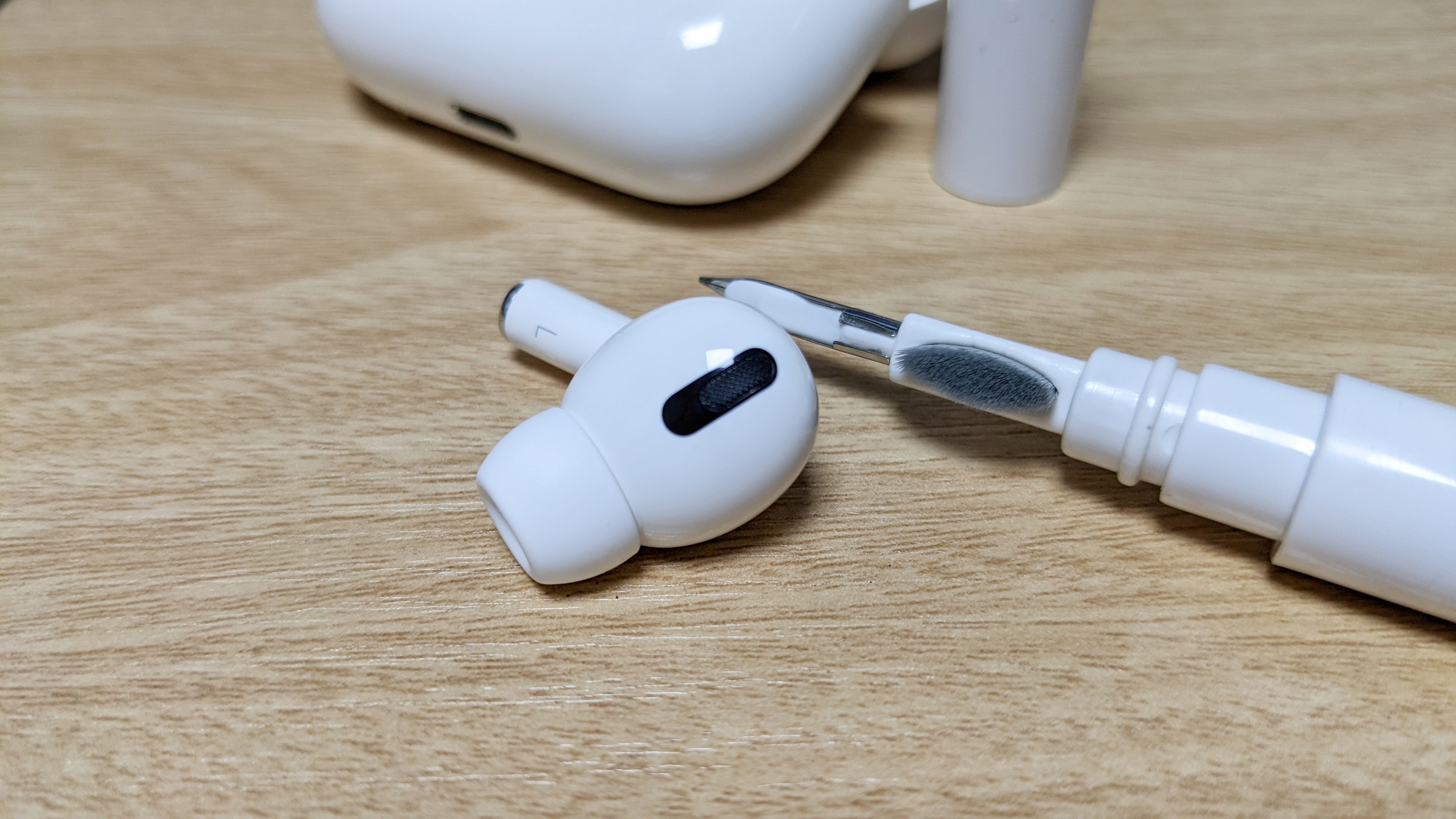 다음은 에어팟 프로를 청소해봤습니다. 에어팟 프로 케이스는 충전부위가 얇고 길게 들어가 있어 청소가 쉽지 않은데, 긴 털 부분을 활용하면 쉽게 청소를 할 수 있습니다. 그리고 에어팟 프로 외부 망부분은 솔로 청소를 해주면 됩니다. 외부 망부분을 제대로 청소하지 않으면 이어폰 사용에 지장을 줄 수 있어 자주 청소해주세요.