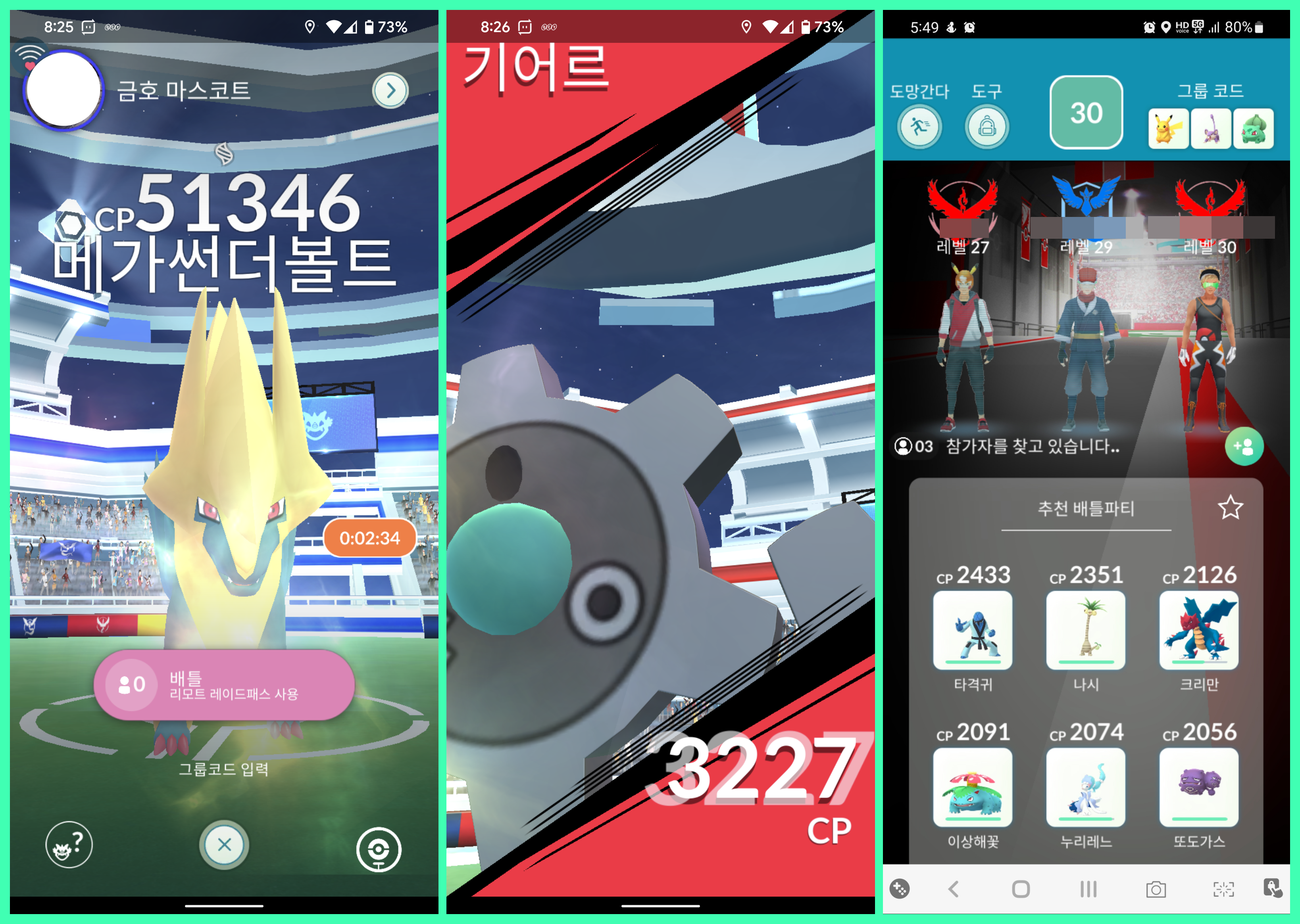 레이드는 체육관에서 진행이 되는데, 상대방 포켓몬 CP가 정말 높습으며 특히 메가가 붙으면 더 높습니다. 그래도 가끔 CP가 낮은 포켓몬도 나오기도 합니다. 레이드이기때문에 다양한 플레이어와 함께 포켓몬을 잡을 수 있습니다. 체육관까지 직접가서 할 수 있고, 멀리 있는 체육관은 리모트 배틀패스를 사용하면 레이드에 참여할 수 있습니다.