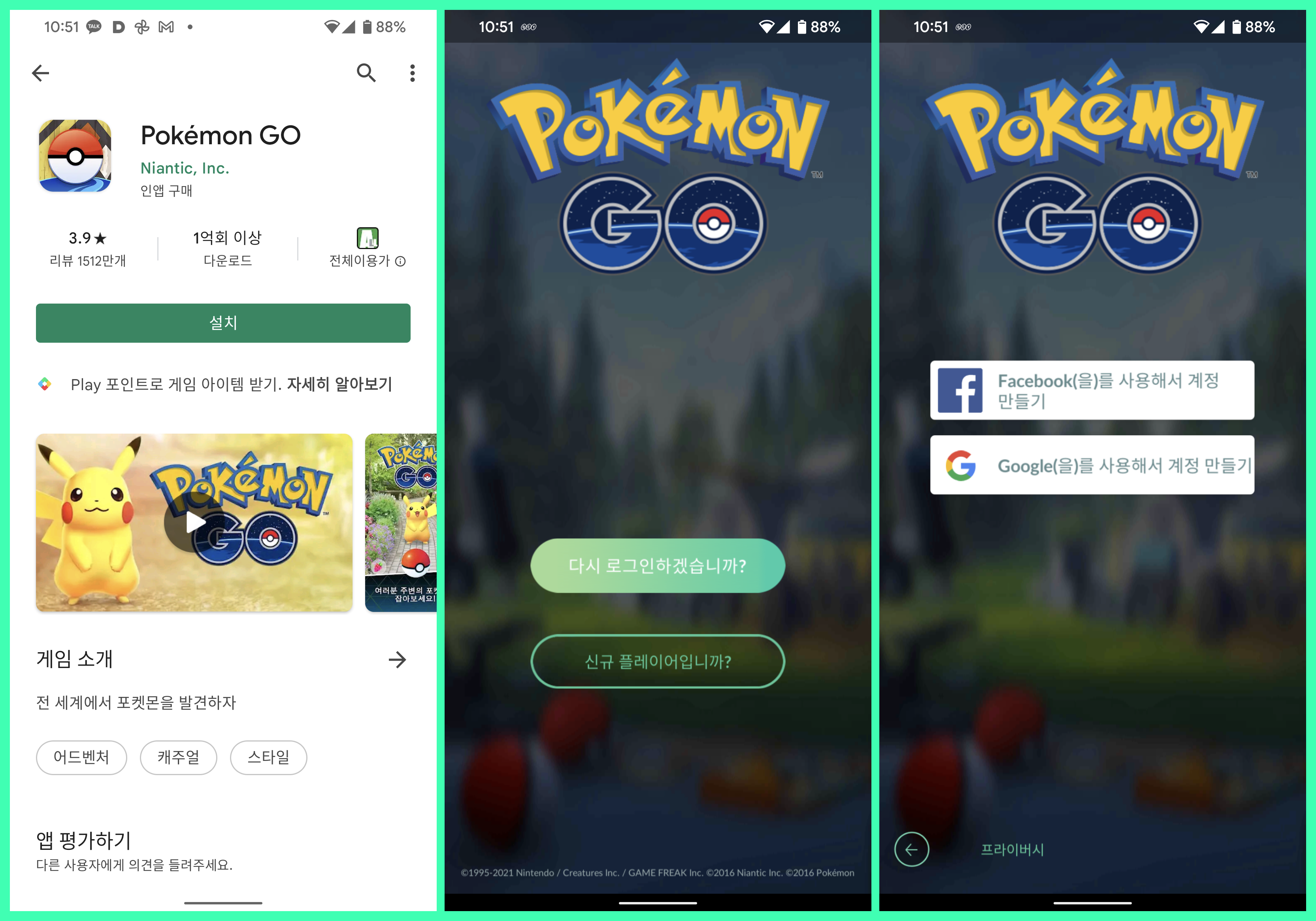 가장먼저 게임을 하기 위해서 앱을 설치해야합니다. 갤럭시 등 안드로이드 스마트폰은 플레이스토어에서, 아이폰은 앱스토어에서 포켓몬GO를 검색해 설치를 해주세요. 설치를 하면 "다시 로그인하겠습니까?"와 "신규 플레이어입니까?" 선택이 나옵니다. 예전 하던분은 다시 로그인을 새롭게 시작하는 분은 신규 플레이를 선택해 주세요.