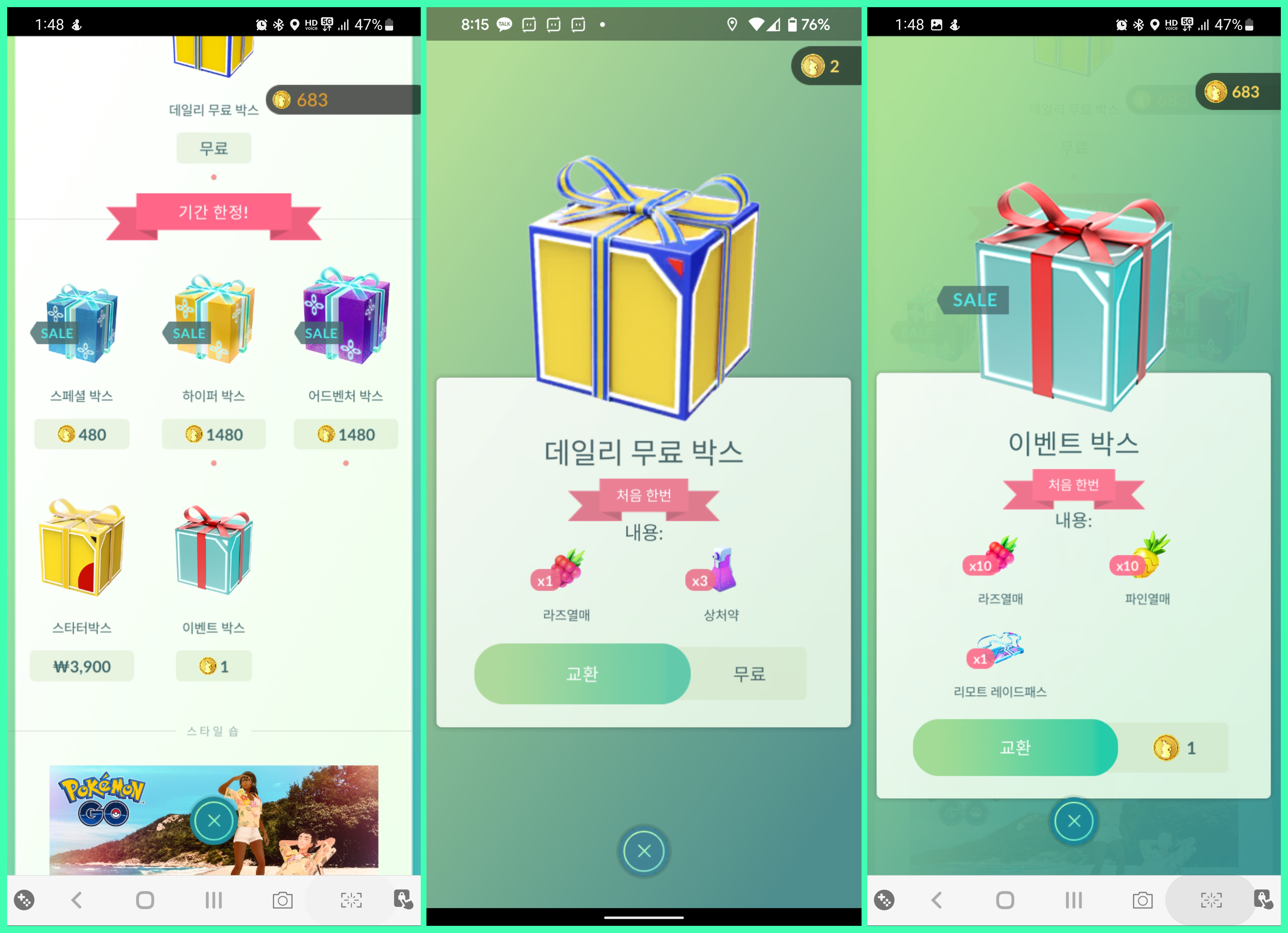 포켓몬고는 무료로 즐길 수 있는 게임이지만 일부 아이템은 유료로 판매를 하고 있습니다. 유료 아이템이 없어도 게임을 즐기는데 지장이 없지만 숍에는 들어가주는게 좋습니다. 데일리 무료 박스를 통해 몬스터볼, 나무열매, 상처약을 받을 수 있습니다. 그리고 가끔씩 이벤트 박스라고 해서 1포켓코인으로 아이템을 구입할 수 있습니다. 이벤트 박스에서 리모트 레이드패스를 얻을 수 있는데, 원래는 이걸 구입하려면 100포켓코인이 필요합니다. 가끔씩 이벤트로 싸게 구입을 할 수 있어 매일 확인해주세요. 포켓코인은 체육관에서 얻을 수 있는데, 이건 체육관 부분에서 설명드리겠습니다.