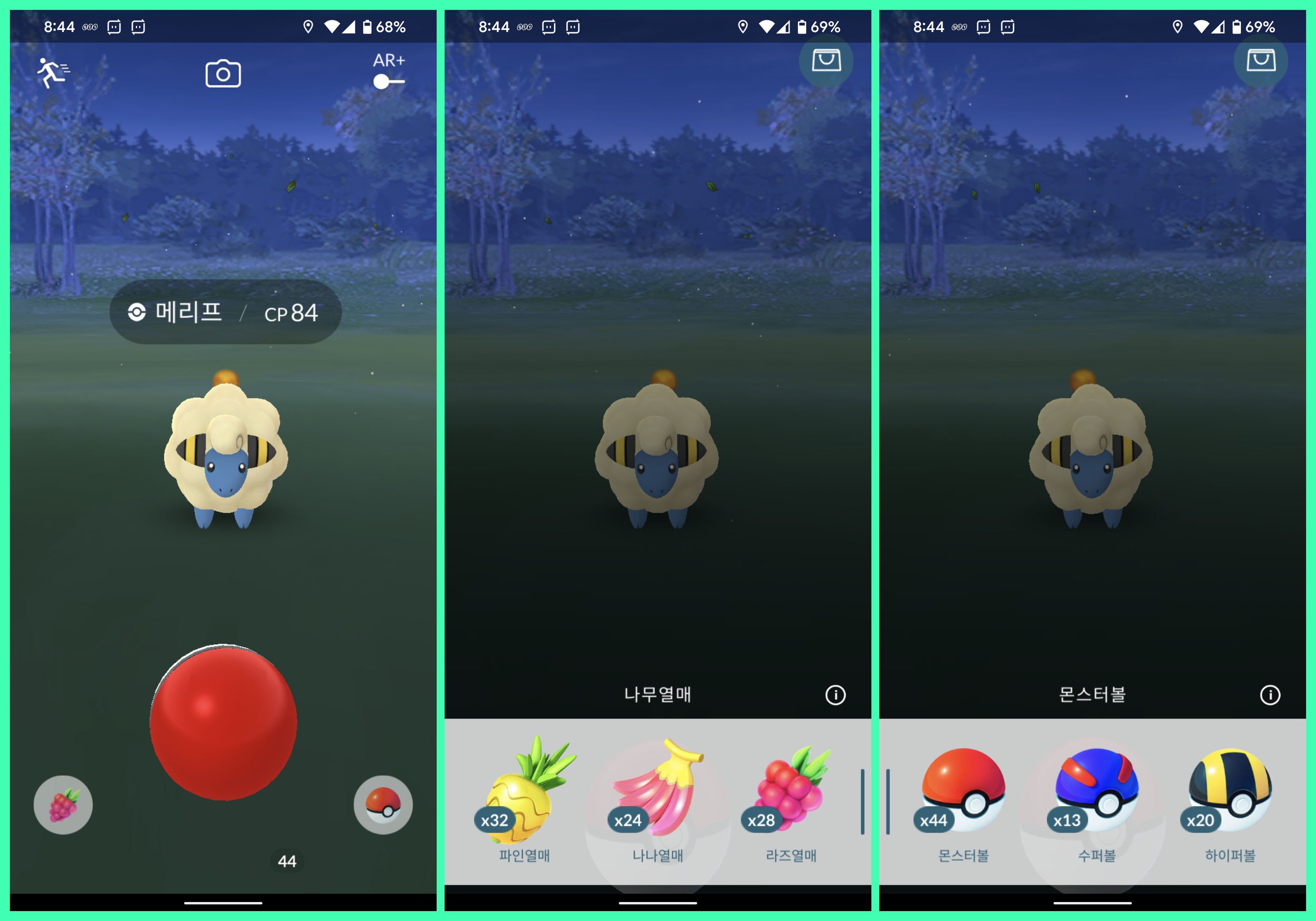 포켓몬고에서 포켓몬을 잡을 때 AR을 켜고 잡을 수 있습니다. AR을 켜면 현실감이 있어 좋긴 하지만, 포켓몬을 잡기 어려워 AR을 끄고 잡습니다. 포켓몬을 잡을 때 나무열매를 줄 수 있습니다. 라즈열매는 포켓몬을 쉽게 잡을 수 있게 도와줍니다. 포켓몬이 움직이는데 나나열매를 주면 움직이지 않고 가만히 있기때문에, 움직임이 많은 녀석들에게 주세요. 파인열매를 주면 포켓몬 사탕을 2배로 줍니다. 포켓몬 사탕은 아래 설명을 드리겠습니다.