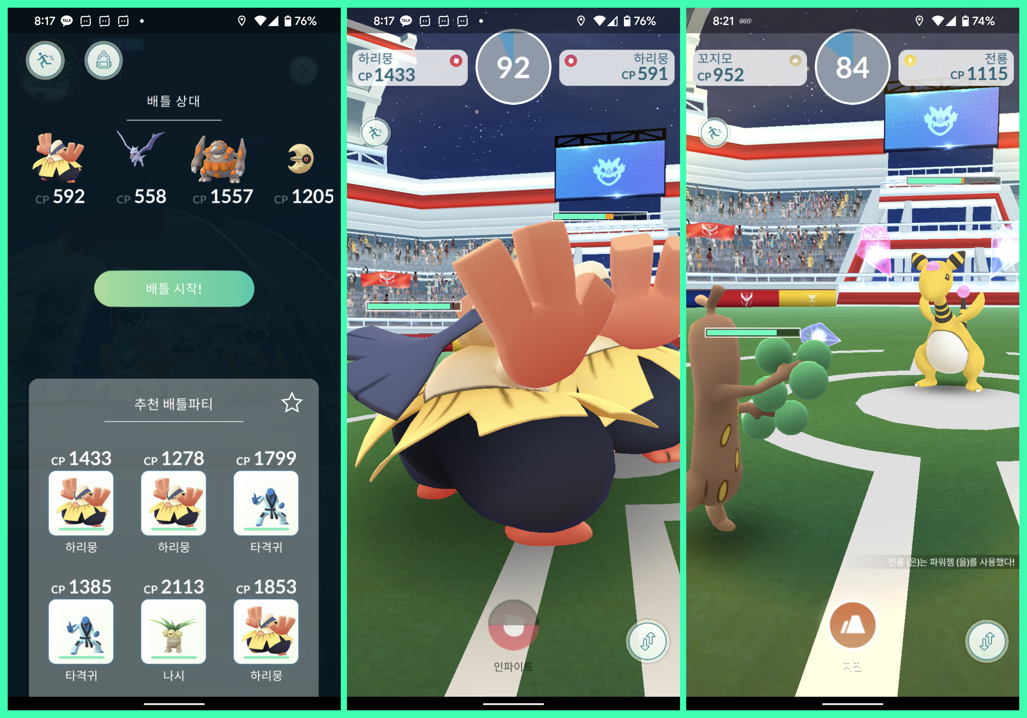 체육관 배틀에 들어가면 포켓몬을 선택해야 합니다. 강력한 포켓몬을 선택하는 것도 좋지만, 포켓몬 배틀은 물, 불, 전기 등 상성이란게 있습니다. 상성에따라 능력치가 낮은 포켓몬이 높은 포켓몬을 잡을 수 있습니다. 보통 추천배틀파티가 상성에 따라 세팅되는 경우가 많으니 포켓몬 상성에 대해 잘 모른다면 추천배틀대로 시작하세요.