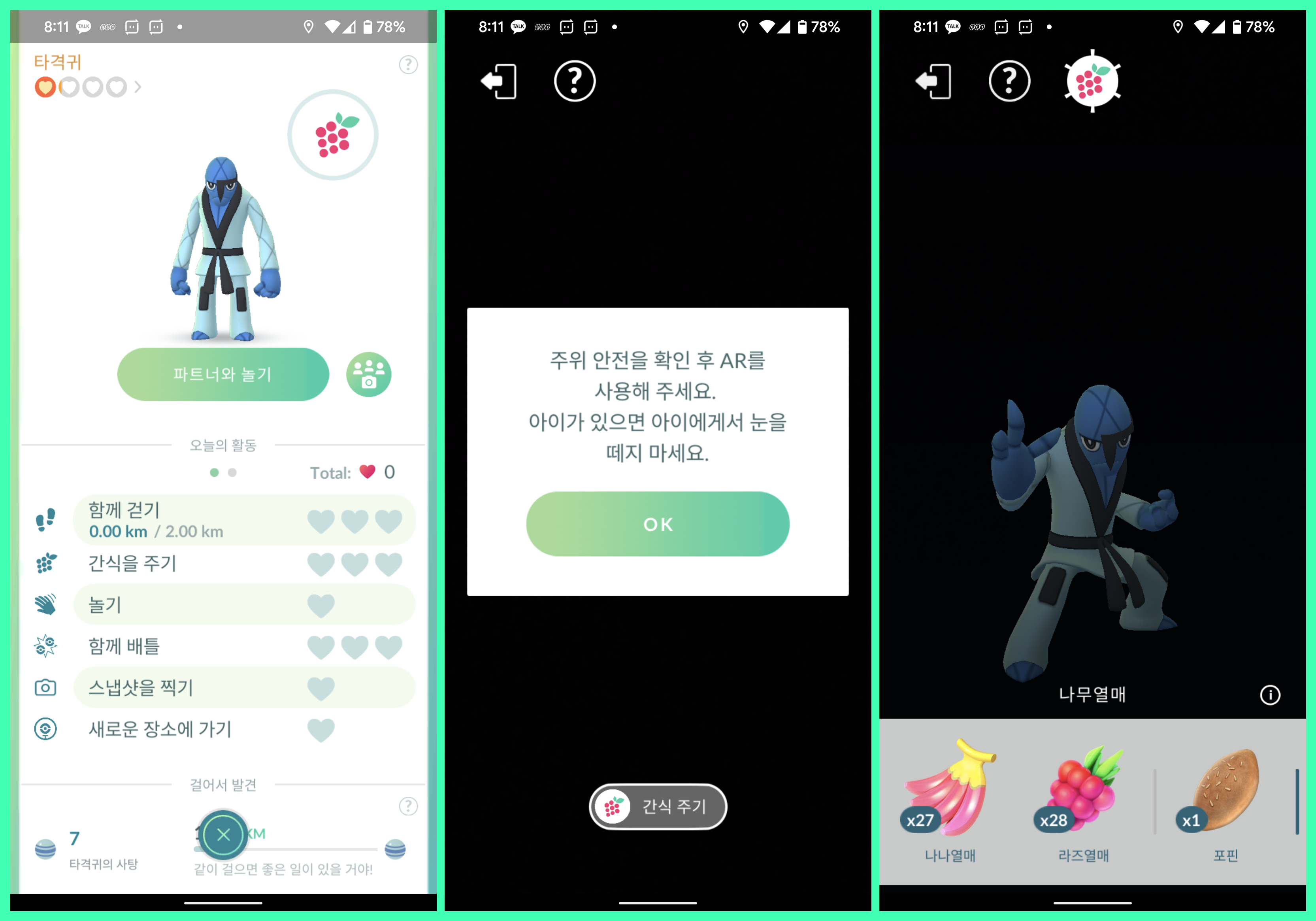 파트너 포켓몬과 함께 걷기 위해선 나무열매를 줘야합니다. 일반 나무 열매는 3개를 줘야 하는데 포핀은 하나만 주면 바로 걸을 수 있습니다. 나무 열매를 주면 파트너 포켓몬이 같이 걷기 시작합니다. 왼쪽 아래 둥근 원으로 에너지가 표시되는데, 에너지가 모두 없어지면 걷기를 중단합니다.
