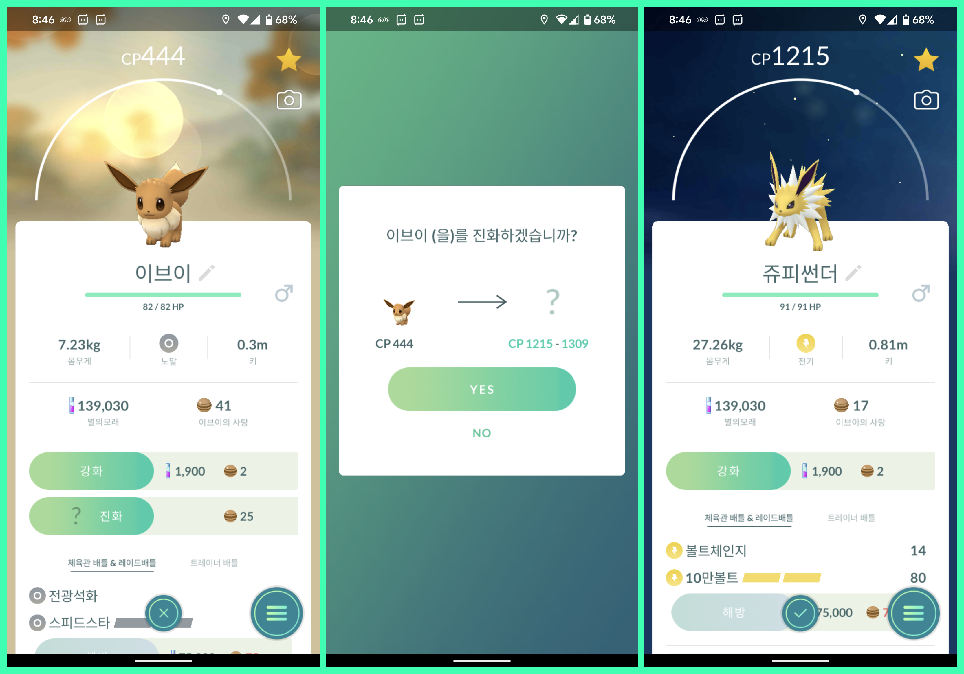 획득한 포켓몬은 강화를 하거나 진화를 할 수 있습니다. 포켓몬을 보면 중간에 강화란 버튼이 있고 그걸 눌러주면 포켓몬 능력치가 상승합니다. 강화를 하기위해선 별의 모래가 필요한데, 포켓몬을 잡거나 미션을 통해 획득할 수 있습니다.