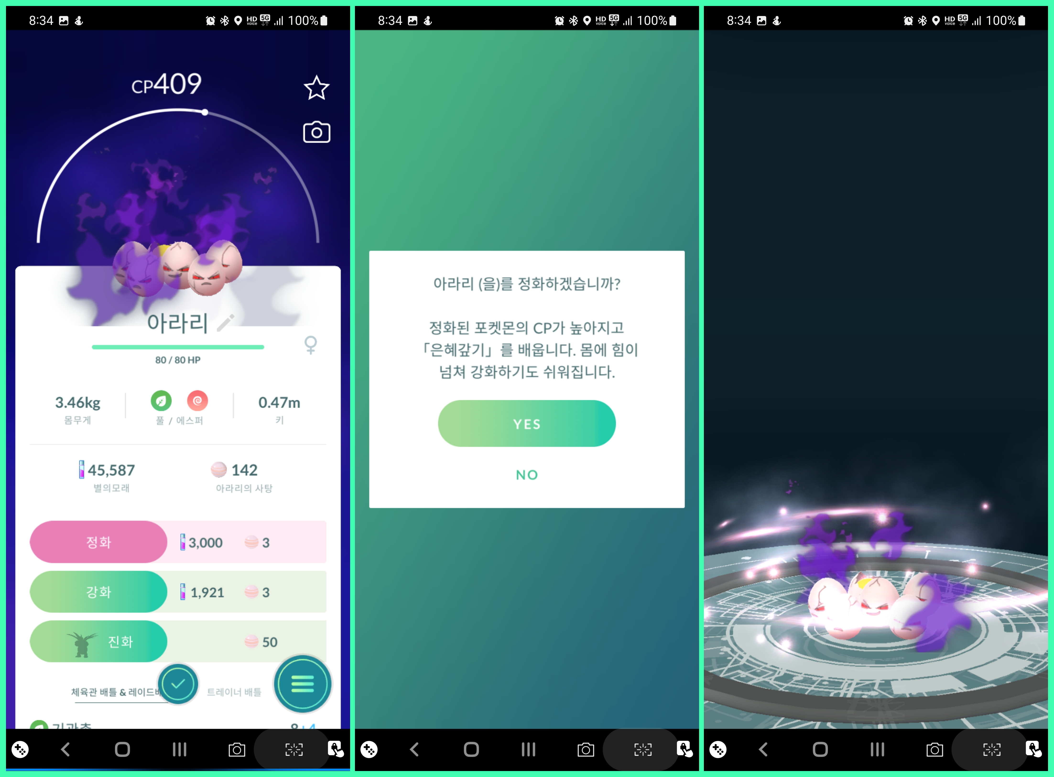 로켓단에게 잡은 포켓몬을 보면 사악해 보이는데, 정화할 수 있습니다. 정화 버튼을 눌러 정화를 하면 CP가 엄청나게 올라갑니다. 그리고 정화된 포켓몬은 반짝거리며, 포켓몬 리스트에서도 별도 표시가 됩니다.