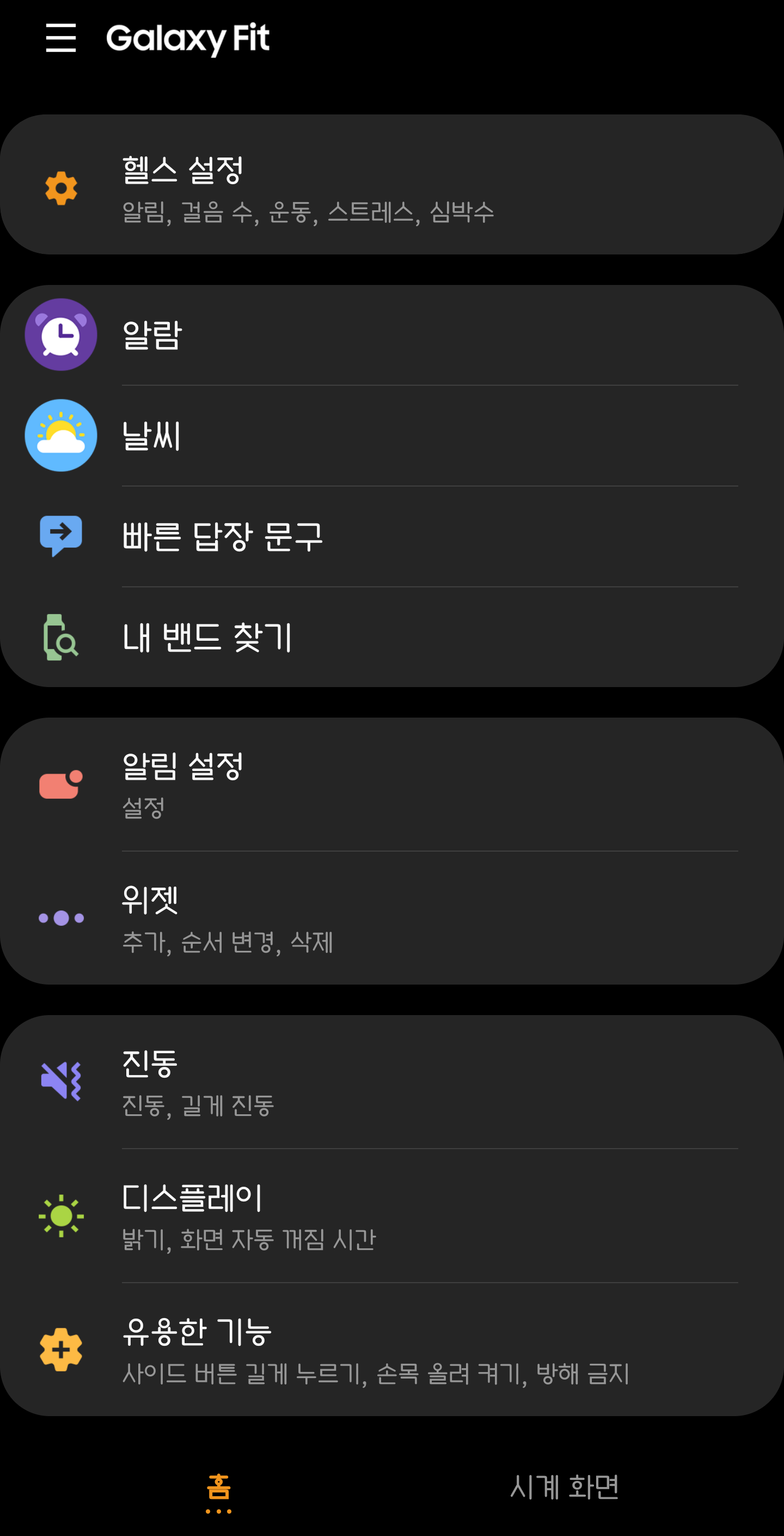 갤럭시 웨어러블 어플에서는 알람, 날씨, 내 밴드 찾기, 진동, 디스플레이 등을 설정할 수 있습니다. 손목을 올리면 화면이 켜지는 설정도 가능합니다. 그리고 방해금지 시간을 설정해 그 시간동안은 알람을 제외한 다른 기능은 작동하지 않도록 할 수 있습니다. 스마트밴드를 가끔 벗어 놓을 때가 있는데 어디에 놨는지 모르는 경우 내 밴드 찾기를 통해 찾을 수 있습니다.