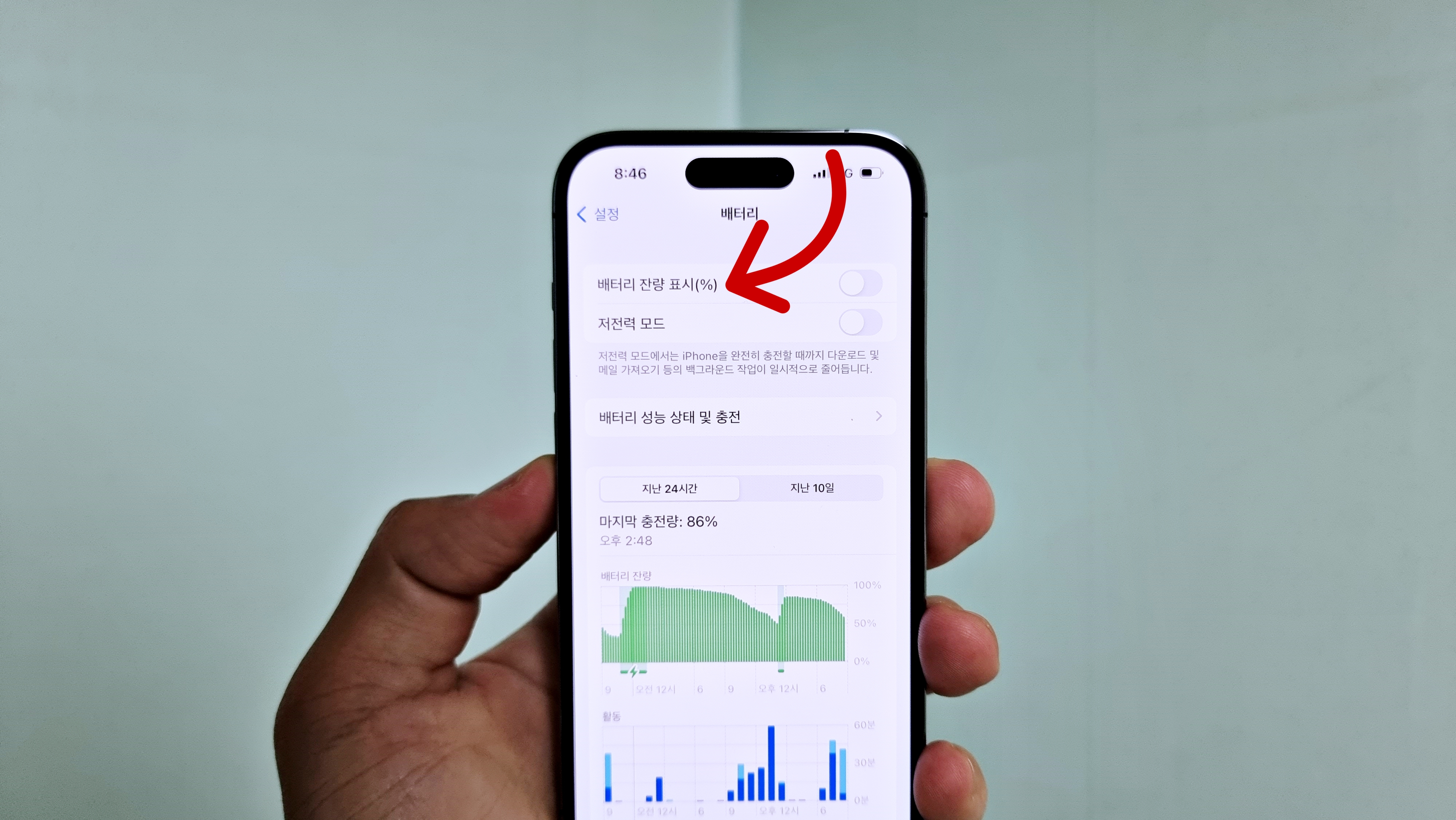 배터리 잔량표시(%)를 활성화 하면 오른쪽 위쪽 배터리 아이콘에 배터리 잔량이 숫자로 표시됩니다. 100% 중 얼마나 남았는지 확인을 할 수 있습니다. 초기에는 배터리 아이콘에 숫자만 표시를 했는데, 지금은 배터리 잔량에 따라 아이콘 모양도 바뀌도록 변경됐습니다.